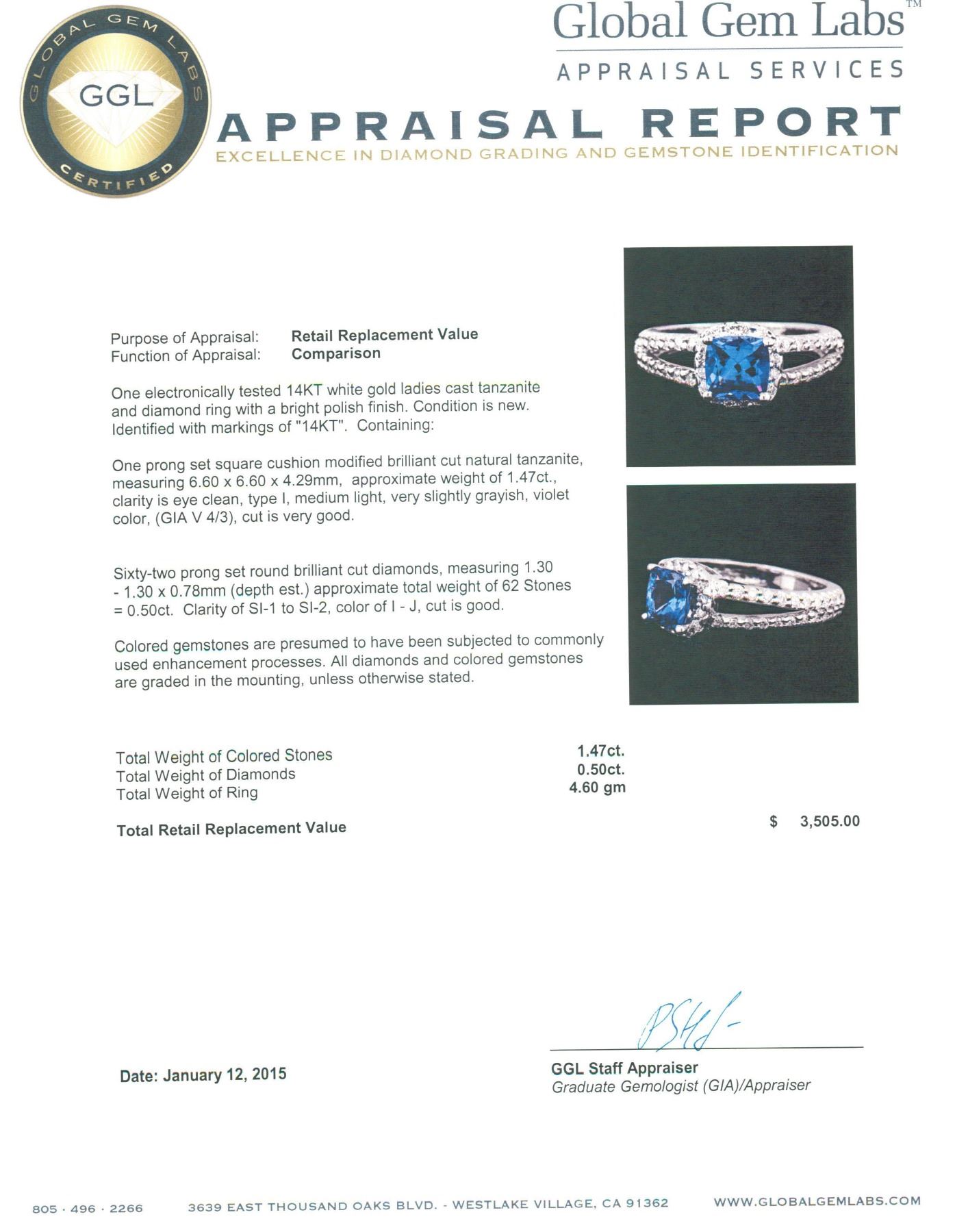One electronically tested 14KT white gold ladies cast tanzanite and diamond ring with a bright polish finish. Identified with markings of "14KT". Condition is new. Containing: One prong set square cushion modified brilliant cut natural tanzanite, measuring 6.60 x 6.60 x 4.29mm, approximate weight of 1.47ct., clarity is eye clean, type I, medium light, very slightly grayish, violet color, (GIA V 4/3), cut is very good. Sixty-Two prong set round brilliant cut diamonds, measuring 1.30 - 1.30 x 0.78mm (depth est.) approximate total weight of 62 Stones = 0.50ct. Clarity: SI-1 to SI-2. Color: I - J, Cut is Good. Colored gemstones are presumed to have been subjected to commonly used enhancement processes. All diamonds and colored gemstones are graded in the mounting, unless otherwise stated. Total Weight of Colored Stones 1.47ct. Total Weight of Diamonds 0.50ct. Total Weight of Ring 4.60 grams. GGL Appraised at $3,505.00.