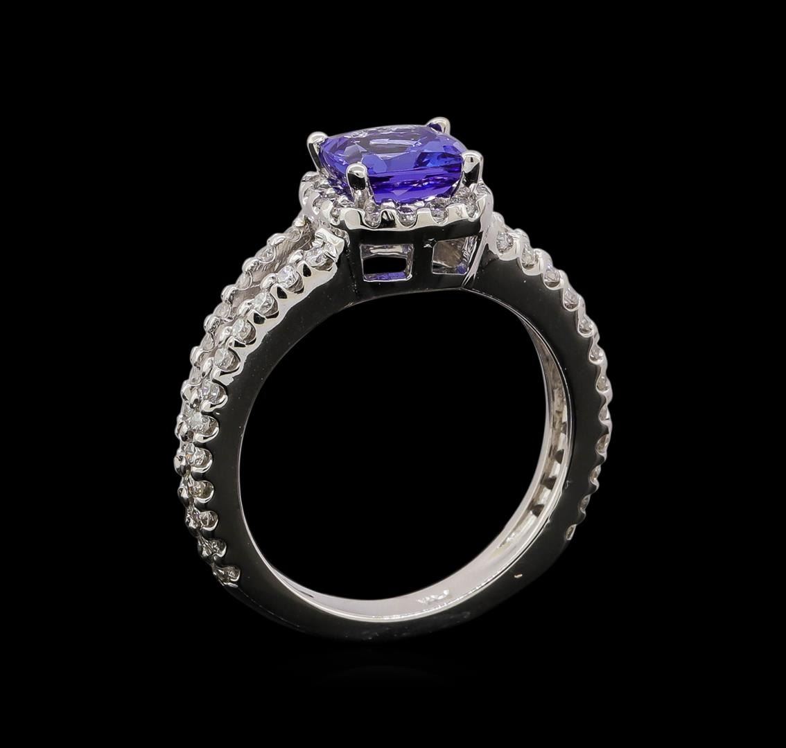 One electronically tested 14KT white gold ladies cast tanzanite and diamond ring with a bright polish finish. Identified with markings of "14KT". Condition is new. Containing: One prong set square cushion modified brilliant cut natural tanzanite, measuring 6.60 x 6.60 x 4.29mm, approximate weight of 1.47ct., clarity is eye clean, type I, medium light, very slightly grayish, violet color, (GIA V 4/3), cut is very good. Sixty-Two prong set round brilliant cut diamonds, measuring 1.30 - 1.30 x 0.78mm (depth est.) approximate total weight of 62 Stones = 0.50ct. Clarity: SI-1 to SI-2. Color: I - J, Cut is Good. Colored gemstones are presumed to have been subjected to commonly used enhancement processes. All diamonds and colored gemstones are graded in the mounting, unless otherwise stated. Total Weight of Colored Stones 1.47ct. Total Weight of Diamonds 0.50ct. Total Weight of Ring 4.60 grams. GGL Appraised at $3,505.00.