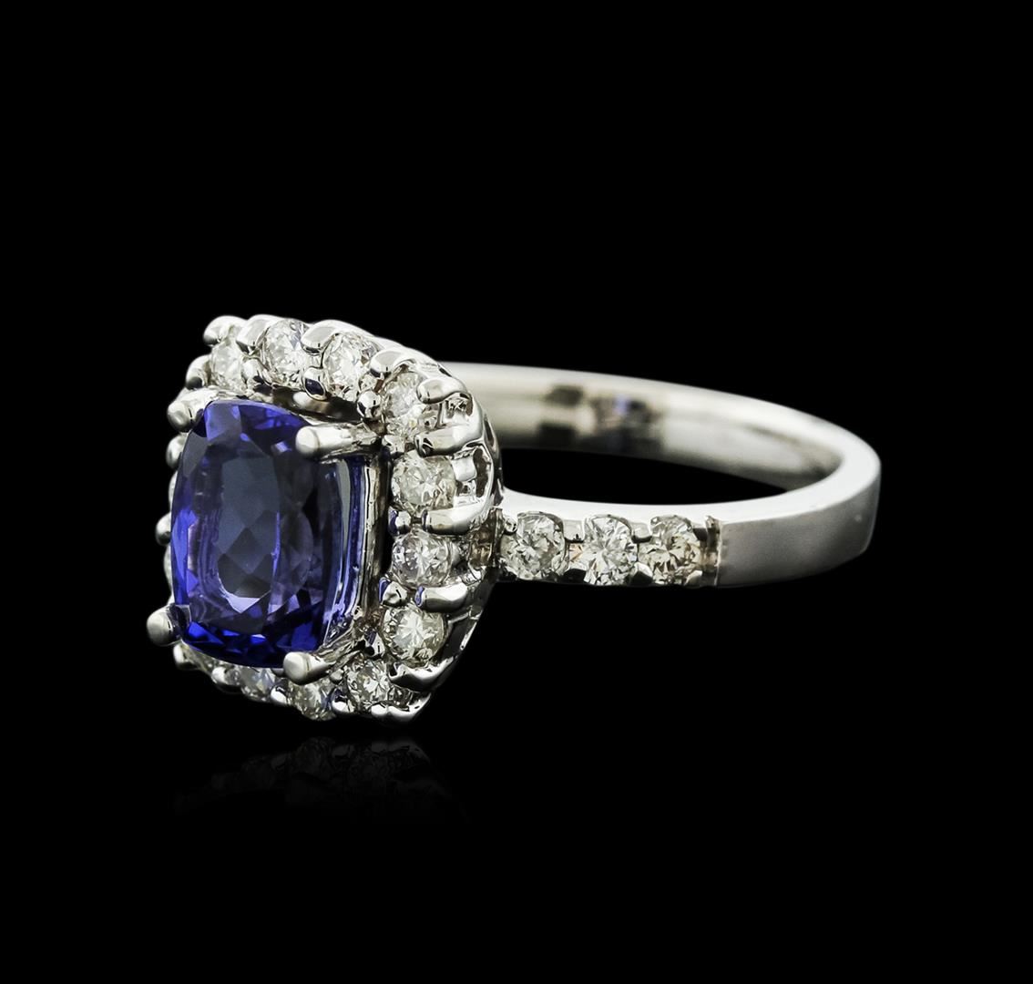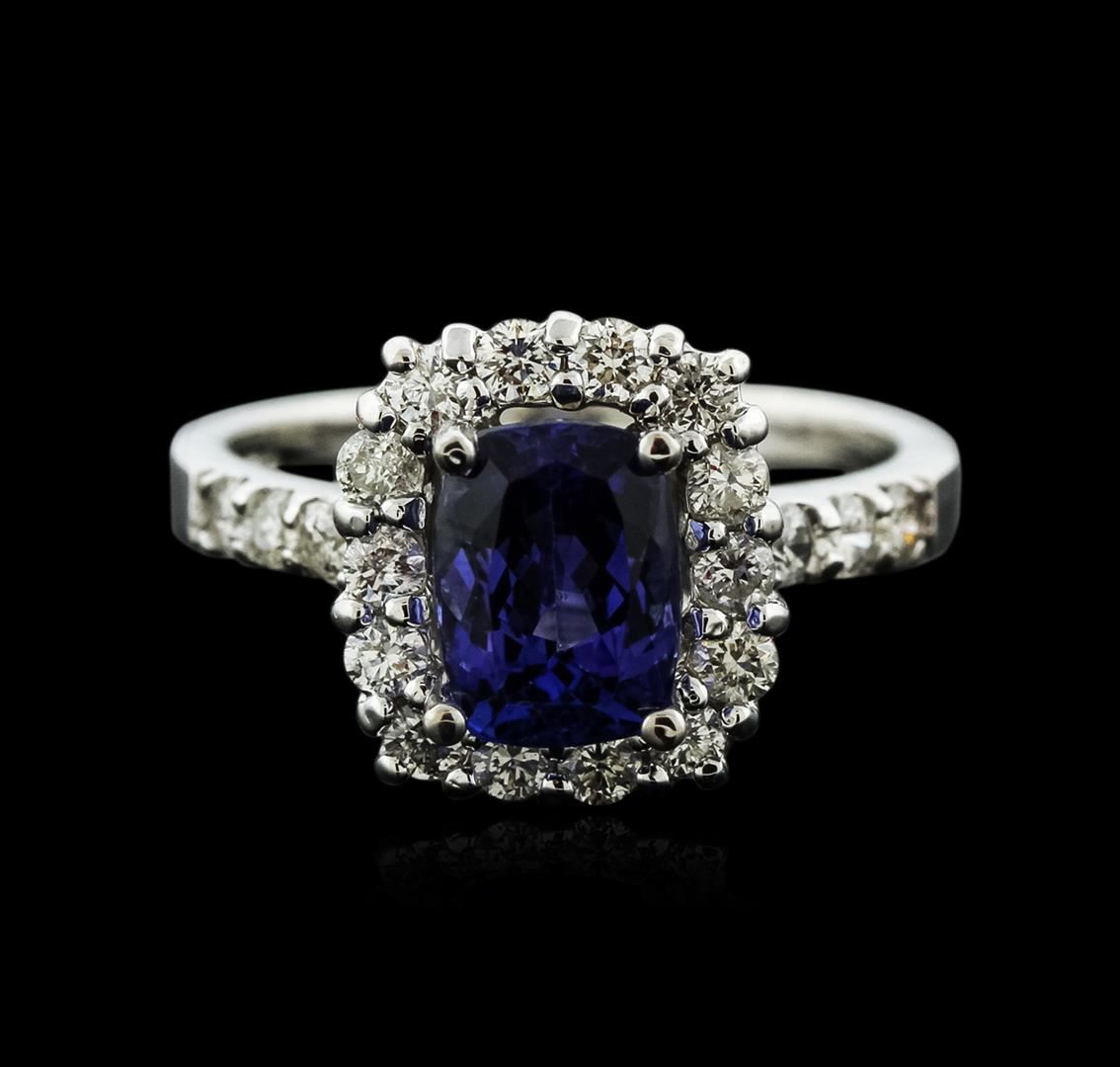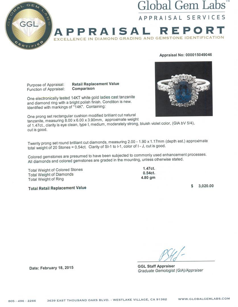 One electronically tested 14KT white gold ladies cast tanzanite and diamond ring with a bright polish finish. Identified with markings of "14K". Condition is new. Containing: One prong set rectangular cushion modified brilliant cut natural tanzanite, measuring 8.00 x 6.00 x 3.90mm, approximate weight of 1.47ct., clarity is eye clean, type I, medium, moderately strong, bluish violet color, (GIA bV 5/4), cut is good. Twenty prong set round brilliant cut diamonds, measuring 2.00 - 1.90 x 1.17mm (depth est.) approximate total weight of 20 Stones = 0.54ct. Clarity: SI-1 to I-1. Color: I - J, Cut is Good. Colored gemstones are presumed to have been subjected to commonly used enhancement processes. All diamonds and colored gemstones are graded in the mounting, unless otherwise stated. Total Weight of Colored Stones 1.47ct. Total Weight of Diamonds 0.54ct. Total Weight of Ring 4.80 grams. GGL Appraised at $3,020.00.