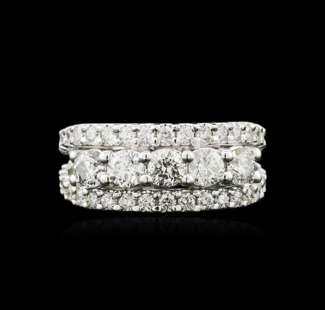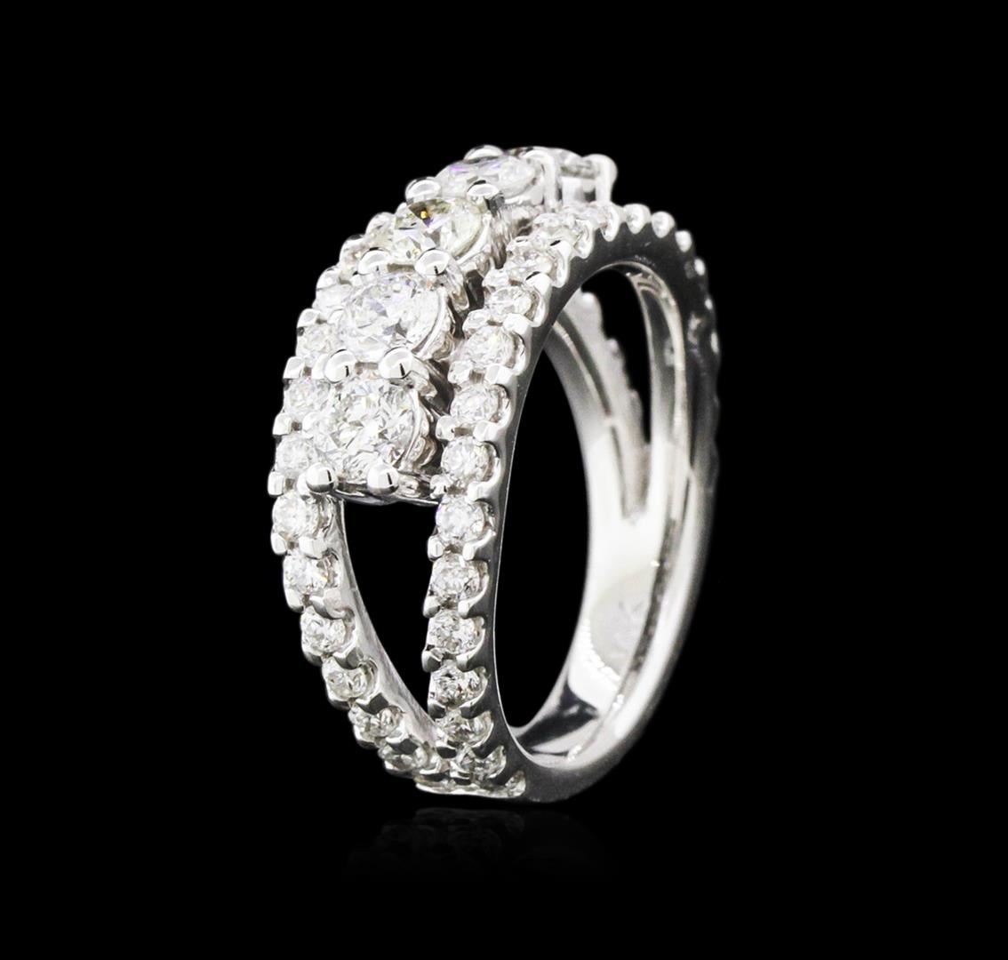 One electronically tested 14KT white gold ladies cast diamond ring with a bright polish finish. Identified with markings of "14K". Condition is new. Containing: Five prong set round brilliant cut diamonds, measuring 3.50 - 3.50 x 2.10mm (depth est.) approximate total weight of 5 Stones = 0.79ct. Clarity: I-1 to I-2. Color: I - K, Cut is Good. Forty-Six prong set round brilliant cut diamonds, measuring 1.60 - 1.60 x 0.96mm (depth est.) approximate total weight of 46 Stones = 0.69ct. Clarity: SI-1 to SI-2. Color: I - J, Cut is Good. All diamonds are graded in the mounting, unless otherwise stated. Total Weight of Diamonds 1.47ct. Total Weight of Ring 6.80 grams. GGL Appraised at $4,715.00.