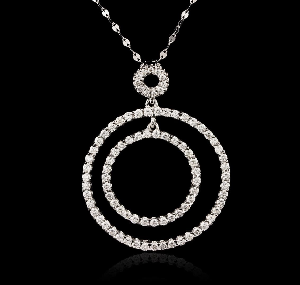 One electronically tested 14KT white gold ladies cast diamond pendant & chain 18.0" long, with a spring ring clasp with a bright polish finish. Identified with markings of "14K". Condition is new. Containing: Ninety prong set round brilliant cut diamonds, measuring 1.80 - 1.50 x 0.99mm (depth est.) approximate total weight of 90 Stones = 1.48ct. Clarity: SI-2 to I-1. Color: H - I, Cut is Good. All diamonds are graded in the mounting, unless otherwise stated. Total Weight of Diamonds 1.48ct. Total Weight of Pendant & Chain 6.50 grams. GGL Appraised at $3,970.00.