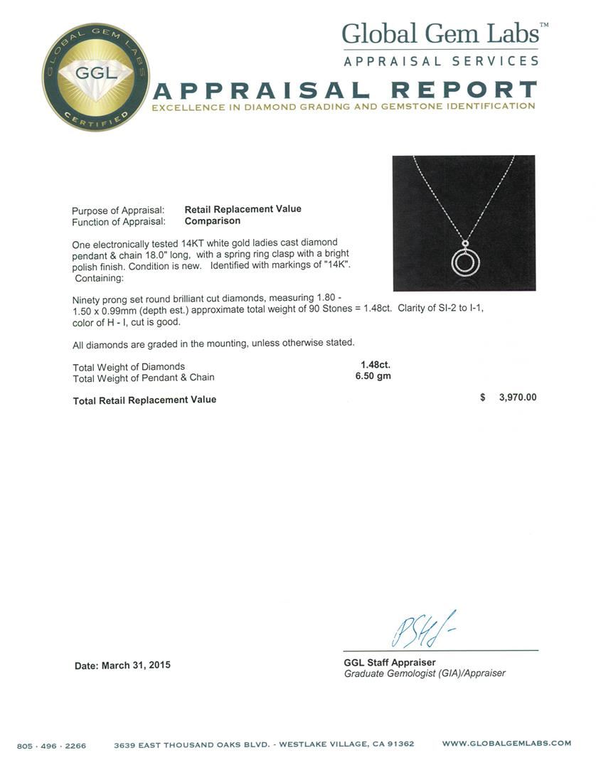 One electronically tested 14KT white gold ladies cast diamond pendant & chain 18.0" long, with a spring ring clasp with a bright polish finish. Identified with markings of "14K". Condition is new. Containing: Ninety prong set round brilliant cut diamonds, measuring 1.80 - 1.50 x 0.99mm (depth est.) approximate total weight of 90 Stones = 1.48ct. Clarity: SI-2 to I-1. Color: H - I, Cut is Good. All diamonds are graded in the mounting, unless otherwise stated. Total Weight of Diamonds 1.48ct. Total Weight of Pendant & Chain 6.50 grams. GGL Appraised at $3,970.00.