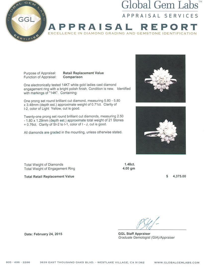 One electronically tested 14KT white gold ladies cast diamond engagement ring with a bright polish finish. Identified with markings of "14K". Condition is new. Containing: One prong set round brilliant cut diamond, measuring 5.80 - 5.80 x 3.48mm (depth est.) approximate weight of 0.71ct. Clarity: I-2, Cut is Good. Twenty-One prong set round brilliant cut diamonds, measuring 2.50 - 1.80 x 1.29mm (depth est.) approximate total weight of 21 Stones = 0.76ct. Clarity: SI-2 to I-1. Color: I - J, Cut is Good. All diamonds are graded in the mounting, unless otherwise stated. Total Weight of Diamonds 1.48ct. Total Weight of Engagement Ring 4.00 grams. GGL Appraised at $4,375.00.