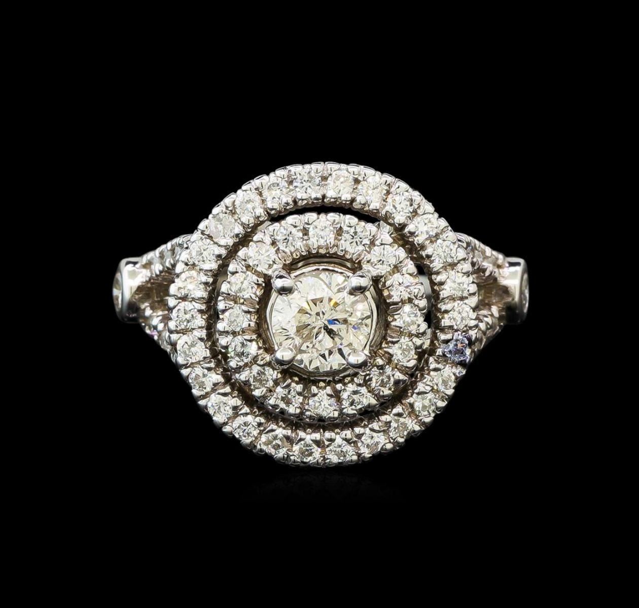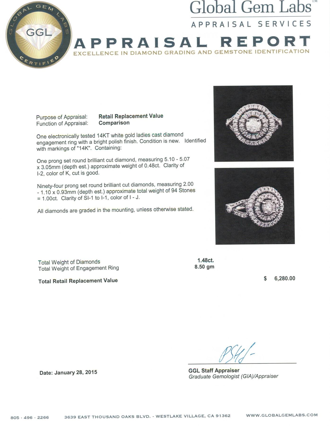 One electronically tested 14KT white gold ladies cast diamond engagement ring with a bright polish finish. Identified with markings of "14K". Condition is new. Containing: One prong set round brilliant cut diamond, measuring 5.10 - 5.07 x 3.05mm (depth est.) approximate weight of 0.48ct. Clarity: I-2. Color: K, Cut is Good. Ninety-Four prong set round brilliant cut diamonds, measuring 2.00 - 1.10 x 0.93mm (depth est.) approximate total weight of 94 Stones = 1.00ct. Clarity: SI-1 to I-1. Color: I - J. All diamonds are graded in the mounting, unless otherwise stated. Total Weight of Diamonds 1.48ct. Total Weight of Engagement Ring 8.50 grams. GGL Appraised.
