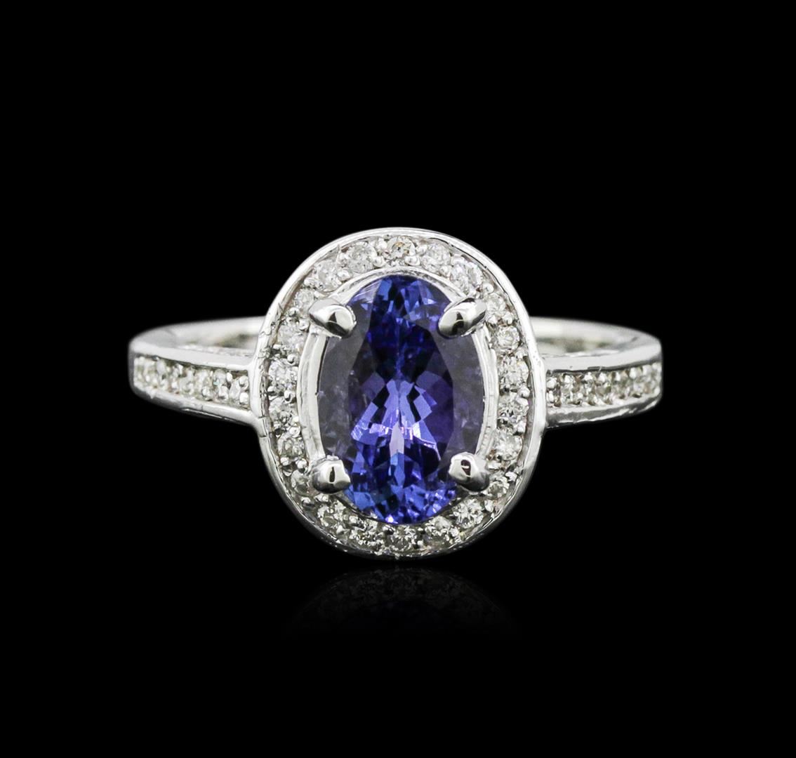 One electronically tested 14KT white gold ladies cast tanzanite and diamond ring with a bright polish finish. Condition is new. Containing: One prong set oval modified brilliant cut natural tanzanite, measuring 9.00 x 6.00 x 3.90mm, approximate weight of 1.48ct., clarity is eye clean, type I, medium light, very slightly grayish, violet color, (GIA V 4/3), cut is good. Thirty-Six prong set round brilliant cut diamonds, measuring 1.30 - 1.30 x 0.78mm (depth est.) approximate total weight of 36 Stones = 0.29ct. Clarity: SI-2 to I-1. Color: I - J, Cut is Good. Colored gemstones are presumed to have been subjected to commonly used enhancement processes. All diamonds and colored gemstones are graded in the mounting, unless otherwise stated. Total Weight of Colored Stones 1.48ct. Total Weight of Diamonds 0.29ct. Total Weight of Ring 4.90 grams. GGL Appraised at $3,020.00.