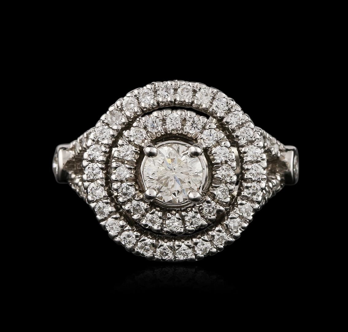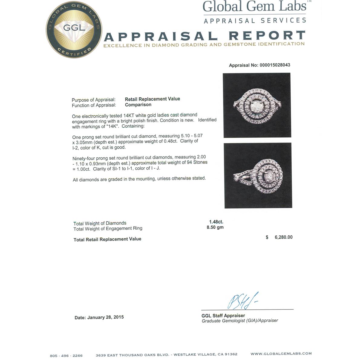 One electronically tested 14KT white gold ladies cast diamond engagement ring with a bright polish finish. Identified with markings of "14K". Condition is new. Containing: One prong set round brilliant cut diamond, measuring 5.10 - 5.07 x 3.05mm (depth est.) approximate weight of 0.48ct. Clarity: I-2. Color: K, Cut is Good. Ninety-Four prong set round brilliant cut diamonds, measuring 2.00 - 1.10 x 0.93mm (depth est.) approximate total weight of 94 Stones = 1.00ct. Clarity: SI-1 to I-1. Color: I - J. All diamonds are graded in the mounting, unless otherwise stated. Total Weight of Diamonds 1.48ct. Total Weight of Engagement Ring 8.50 grams. GGL Appraised at $6,280.00.