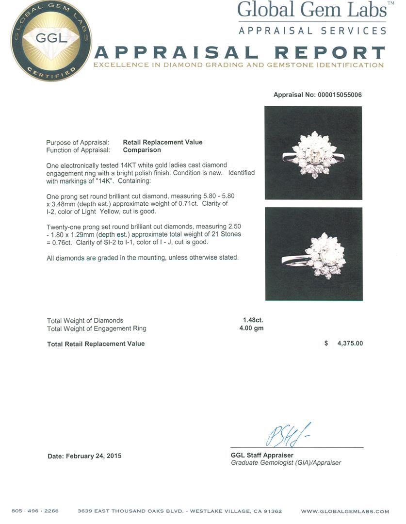 One electronically tested 14KT white gold ladies cast diamond engagement ring with a bright polish finish. Identified with markings of "14K". Condition is new. Containing: One prong set round brilliant cut diamond, measuring 5.80 - 5.80 x 3.48mm (depth est.) approximate weight of 0.71ct. Clarity: I-2, Cut is Good. Twenty-One prong set round brilliant cut diamonds, measuring 2.50 - 1.80 x 1.29mm (depth est.) approximate total weight of 21 Stones = 0.76ct. Clarity: SI-2 to I-1. Color: I - J, Cut is Good. All diamonds are graded in the mounting, unless otherwise stated. Total Weight of Diamonds 1.48ct. Total Weight of Engagement Ring 4.00 grams. GGL Appraised at $4,375.00.