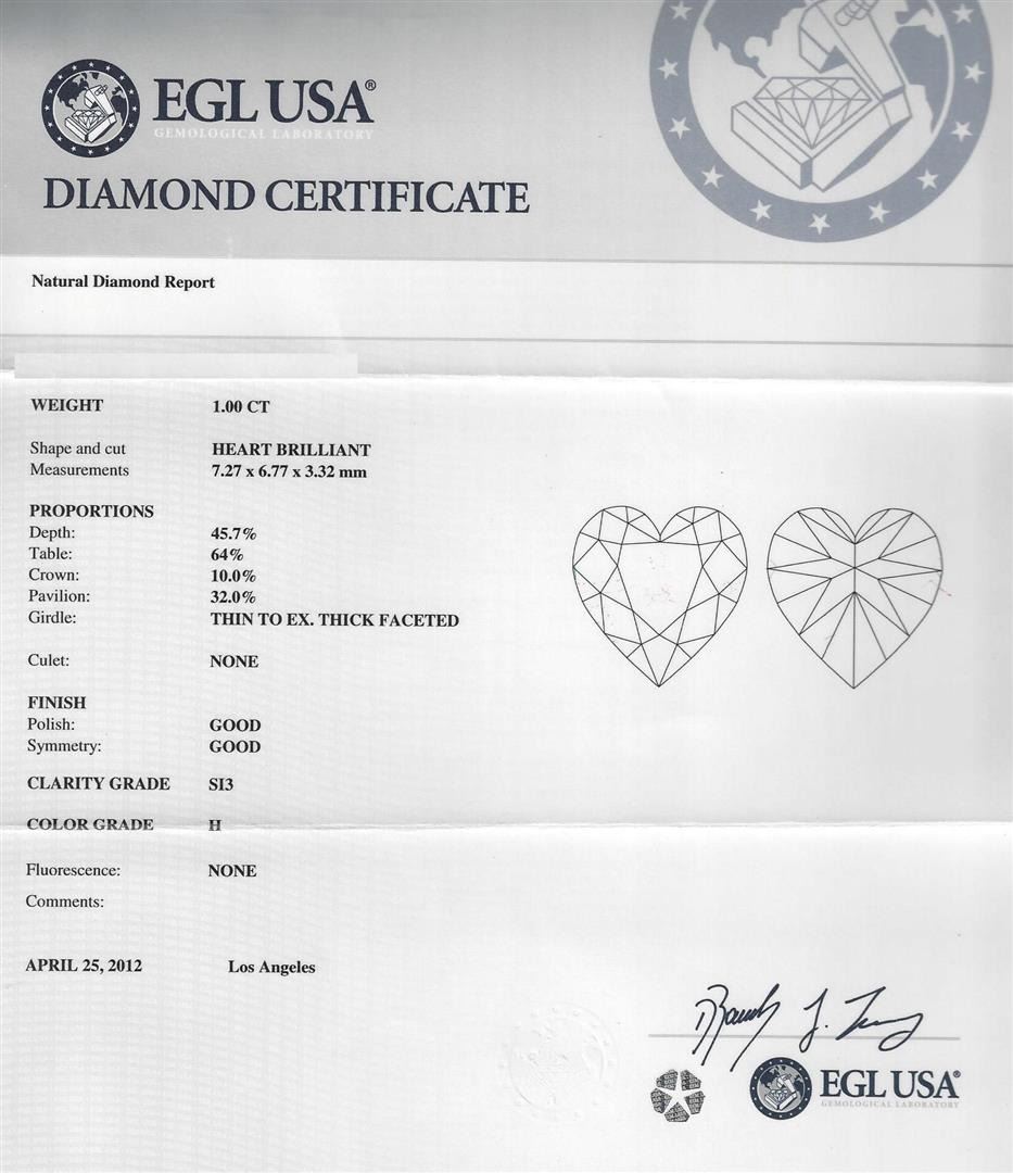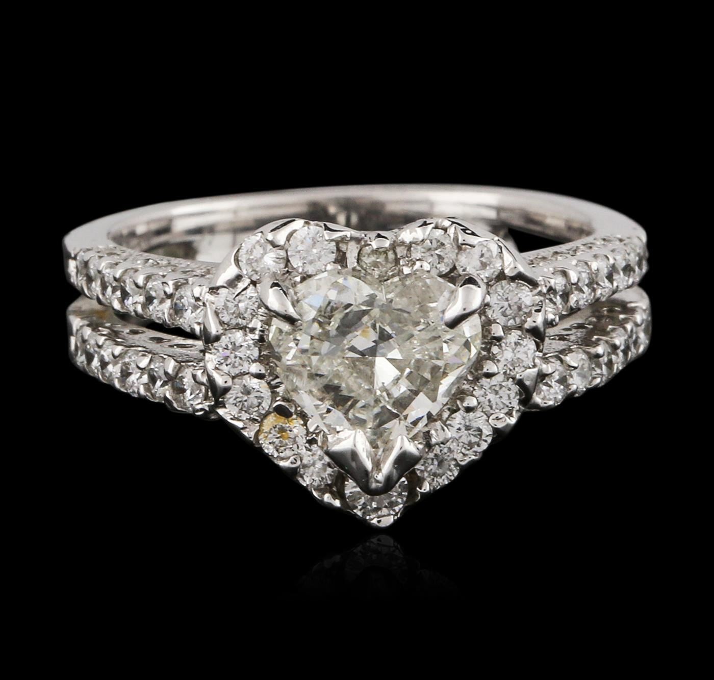 One ring featuring: 14KT white gold weighing 5.72 grams containing diamonds with a total weight of 1.49ct. Center Diamond: Weight: 1.00 ct. Shape and cut: Heart Brilliant. Measurements: 7.27 x 6.77 x 3.32mm. Depth: 45.7%. Table: 64%. Crown: 10.0%. Pavilion: 32.0%. Girdle: Thin To Ex. Thick Faceted. Culet: None. Polish: Good. Symmetry: Good. Clarity Grade: SI3. Color Grade: H. Fluorescence: None. UGS Appraised.