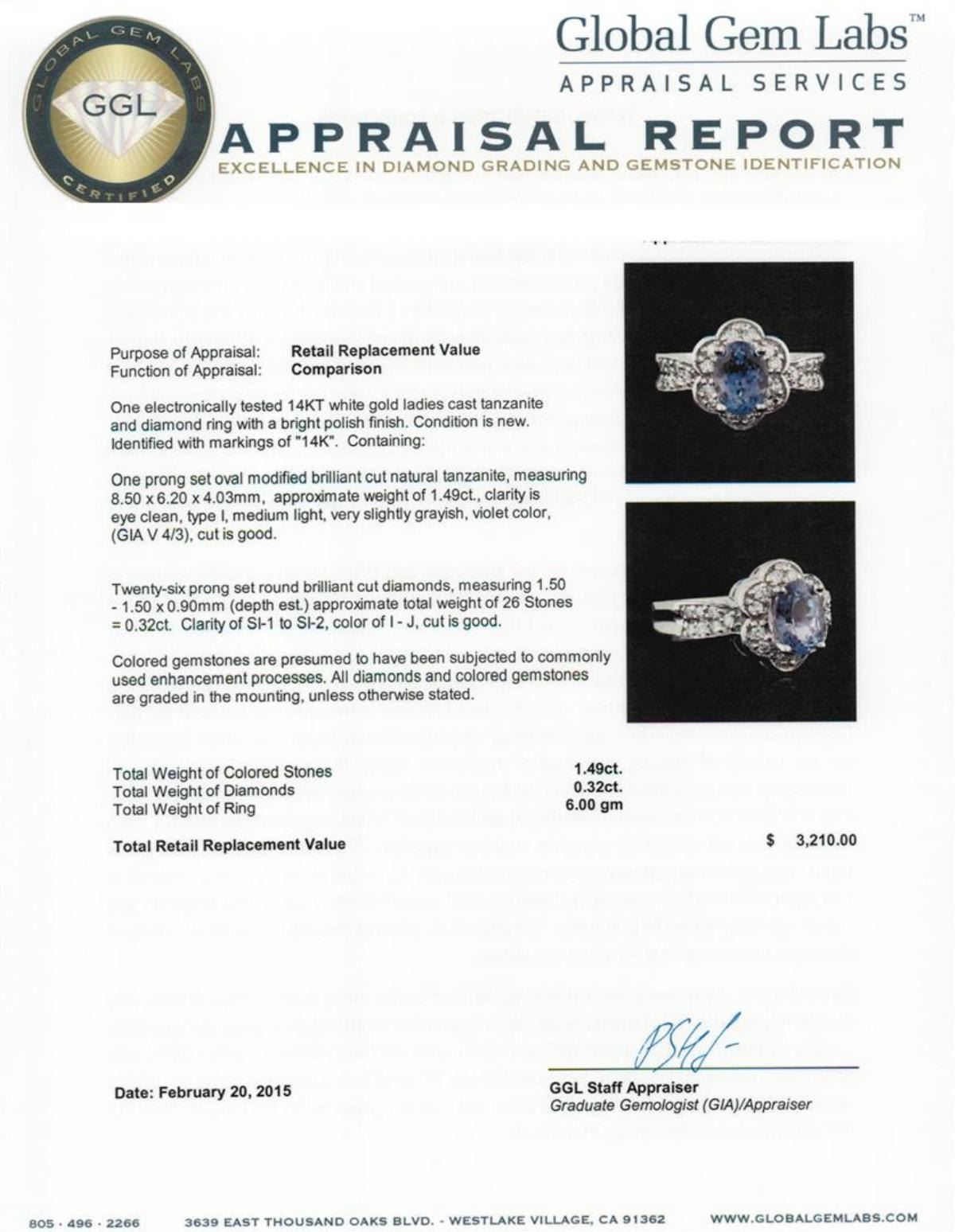 One electronically tested 14KT white gold ladies cast tanzanite and diamond ring with a bright polish finish. Identified with markings of "14K". Condition is new. Containing: One prong set oval modified brilliant cut natural tanzanite, measuring 8.50 x 6.20 x 4.03mm, approximate weight of 1.49ct., clarity is eye clean, type I, medium light, very slightly grayish, violet color, (GIA V 4/3), cut is good. Twenty-Six prong set round brilliant cut diamonds, measuring 1.50 - 1.50 x 0.90mm (depth est.) approximate total weight of 26 Stones = 0.32ct. Clarity: SI-1 to SI-2. Color: I - J, Cut is Good. Colored gemstones are presumed to have been subjected to commonly used enhancement processes. All diamonds and colored gemstones are graded in the mounting, unless otherwise stated. Total Weight of Colored Stones 1.49ct. Total Weight of Diamonds 0.32ct. Total Weight of Ring 6.00 grams. GGL Appraised.