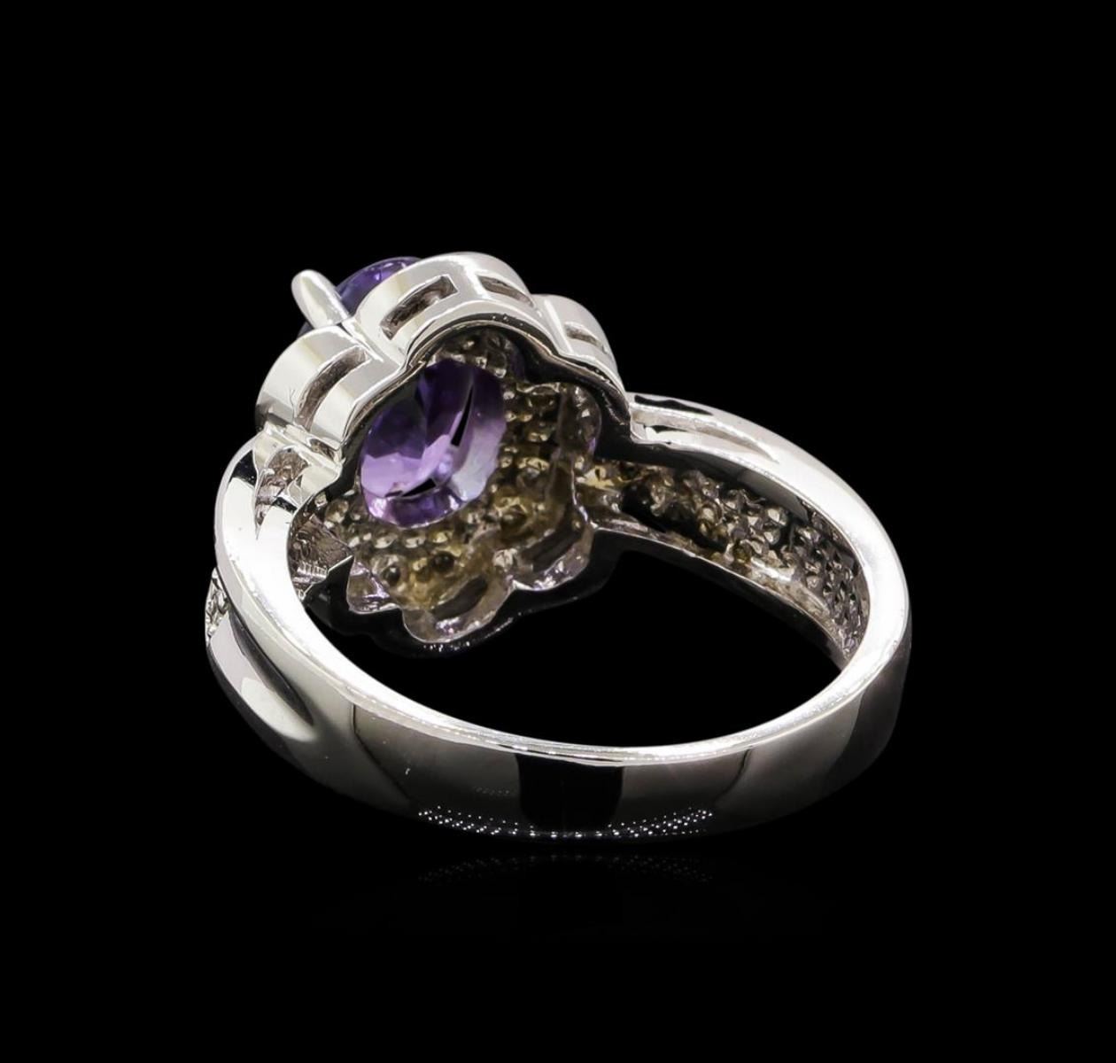 One electronically tested 14KT white gold ladies cast tanzanite and diamond ring with a bright polish finish. Identified with markings of "14K". Condition is new. Containing: One prong set oval modified brilliant cut natural tanzanite, measuring 8.50 x 6.20 x 4.03mm, approximate weight of 1.49ct., clarity is eye clean, type I, medium light, very slightly grayish, violet color, (GIA V 4/3), cut is good. Twenty-Six prong set round brilliant cut diamonds, measuring 1.50 - 1.50 x 0.90mm (depth est.) approximate total weight of 26 Stones = 0.32ct. Clarity: SI-1 to SI-2. Color: I - J, Cut is Good. Colored gemstones are presumed to have been subjected to commonly used enhancement processes. All diamonds and colored gemstones are graded in the mounting, unless otherwise stated. Total Weight of Colored Stones 1.49ct. Total Weight of Diamonds 0.32ct. Total Weight of Ring 6.00 grams. GGL Appraised.