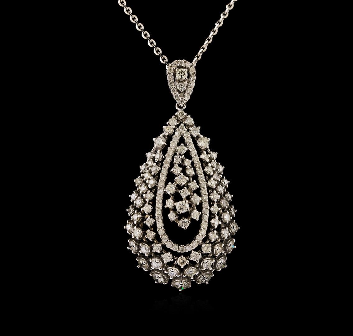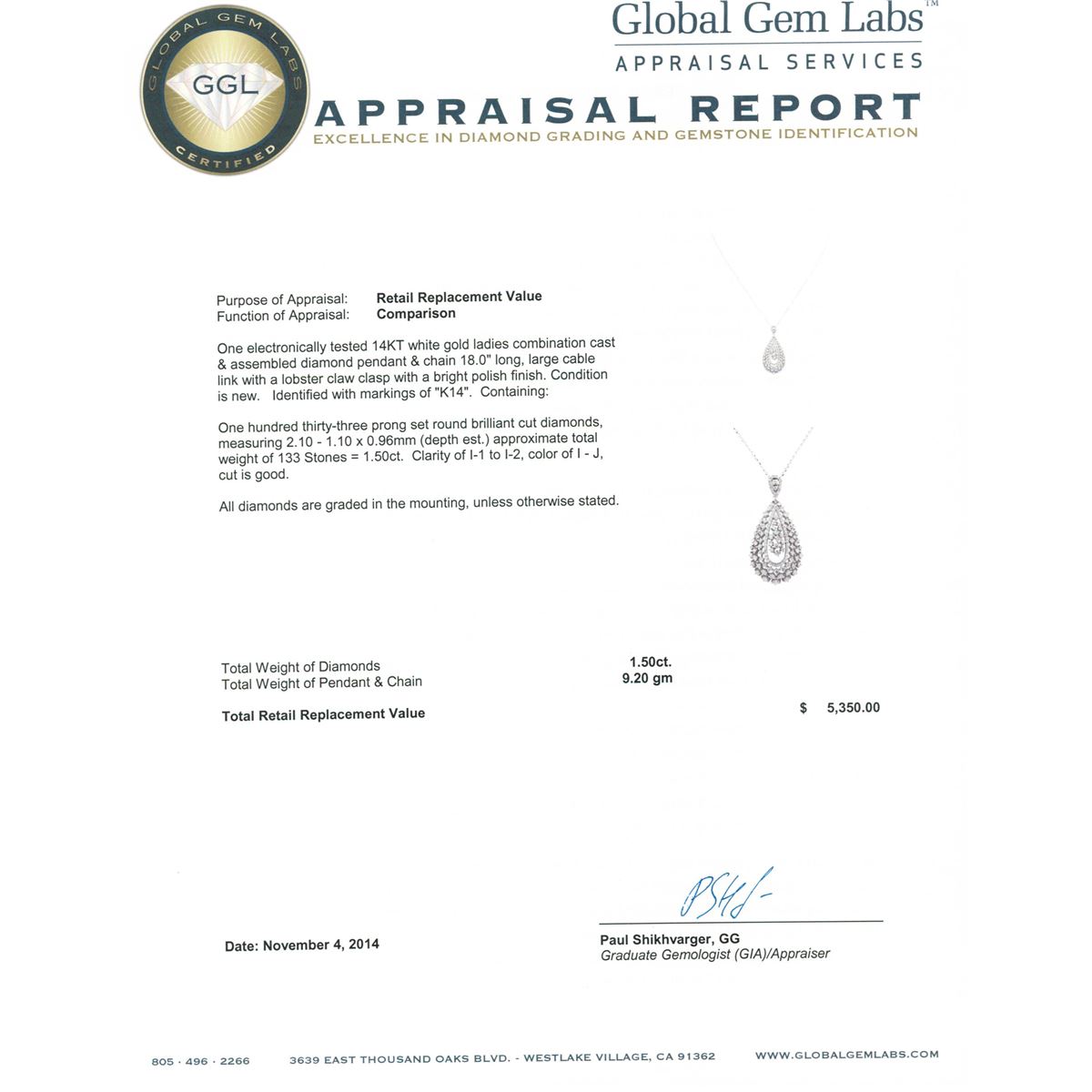 One electronically tested 14KT white gold ladies combination cast & assembled diamond pendant & chain 18.0" long, large cable link with a lobster claw clasp with a bright polish finish. Identified with markings of "K14". Condition is new. Containing: One Hundred Thirty-Three prong set round brilliant cut diamonds, measuring 2.10 - 1.10 x 0.96mm (depth est.) approximate total weight of 133 Stones = 1.50ct. Clarity: I-1 to I-2. Color: I - J, Cut is Good. All diamonds are graded in the mounting, unless otherwise stated. Total Weight of Diamonds 1.50ct. Total Weight of Pendant & Chain 9.20 grams. GGL Appraised at $5,350.00.