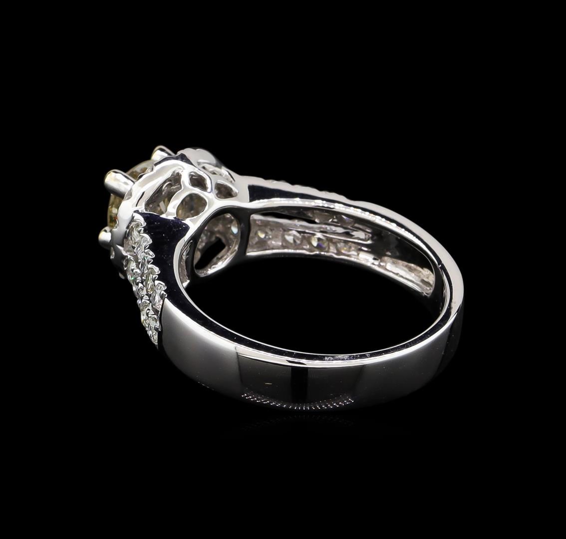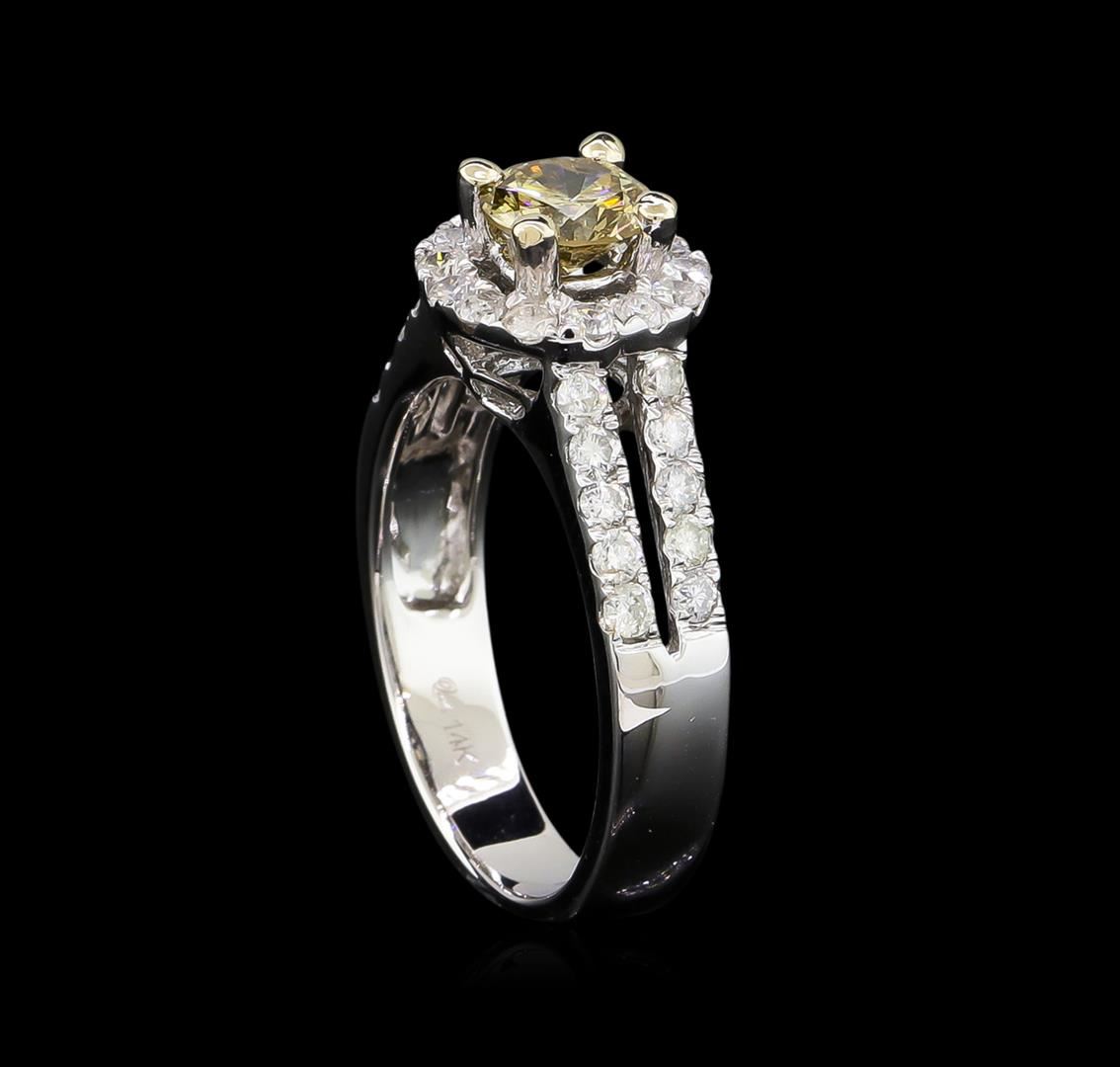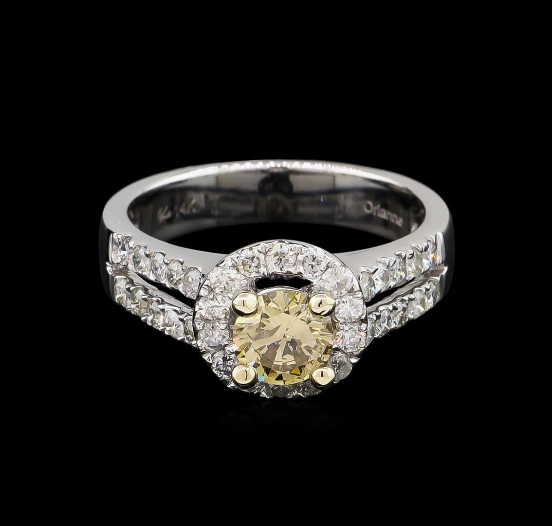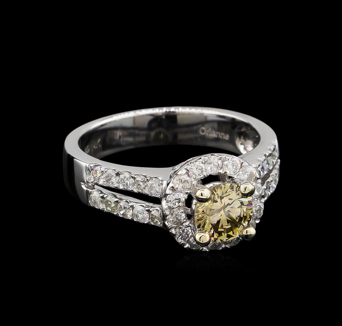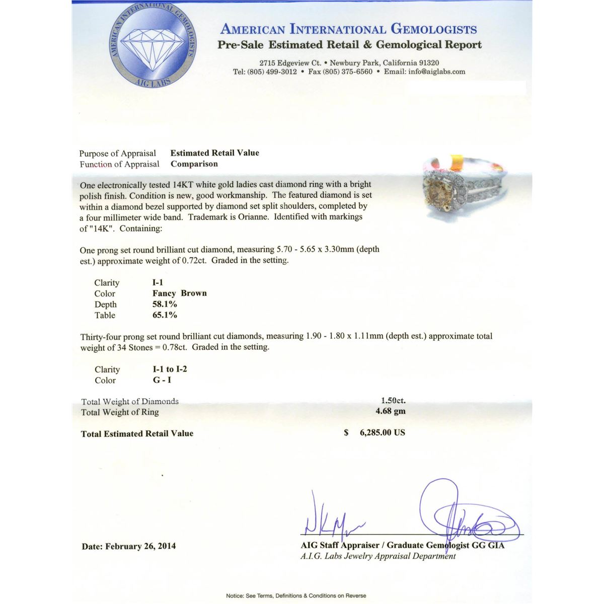 One electronically tested 14KT white gold ladies cast diamond ring with a bright polish finish. Condition is new, good workmanship. The featured diamond is set within a diamond bezel supported by diamond split shoulders, completed by a four millimeter wide band. Trademark is Orianne. Identified with markings of "14K". Containing: One prong set round brilliant cut diamond, measuring 5.70 - 5.65 x 3.30mm (depth est) approximate weight of 0.72ct. Graded in the setting. Clarity I-1 Color Fancy Brown Depth 58.1% Table 65.1%. Thirty-four prong set round brilliant cut diamonds, measuring 1.90 - 1.80 x 1.11mm (depth est) approximate total weight of 34 Stones = 0.78ct. Graded in the setting. Clarity I-1 to I-2. Color G-I. Total Weight of Diamonds 1.50ct. Total Weight of Ring 4.68 grams. AIG Appraised at $6,285.00.
