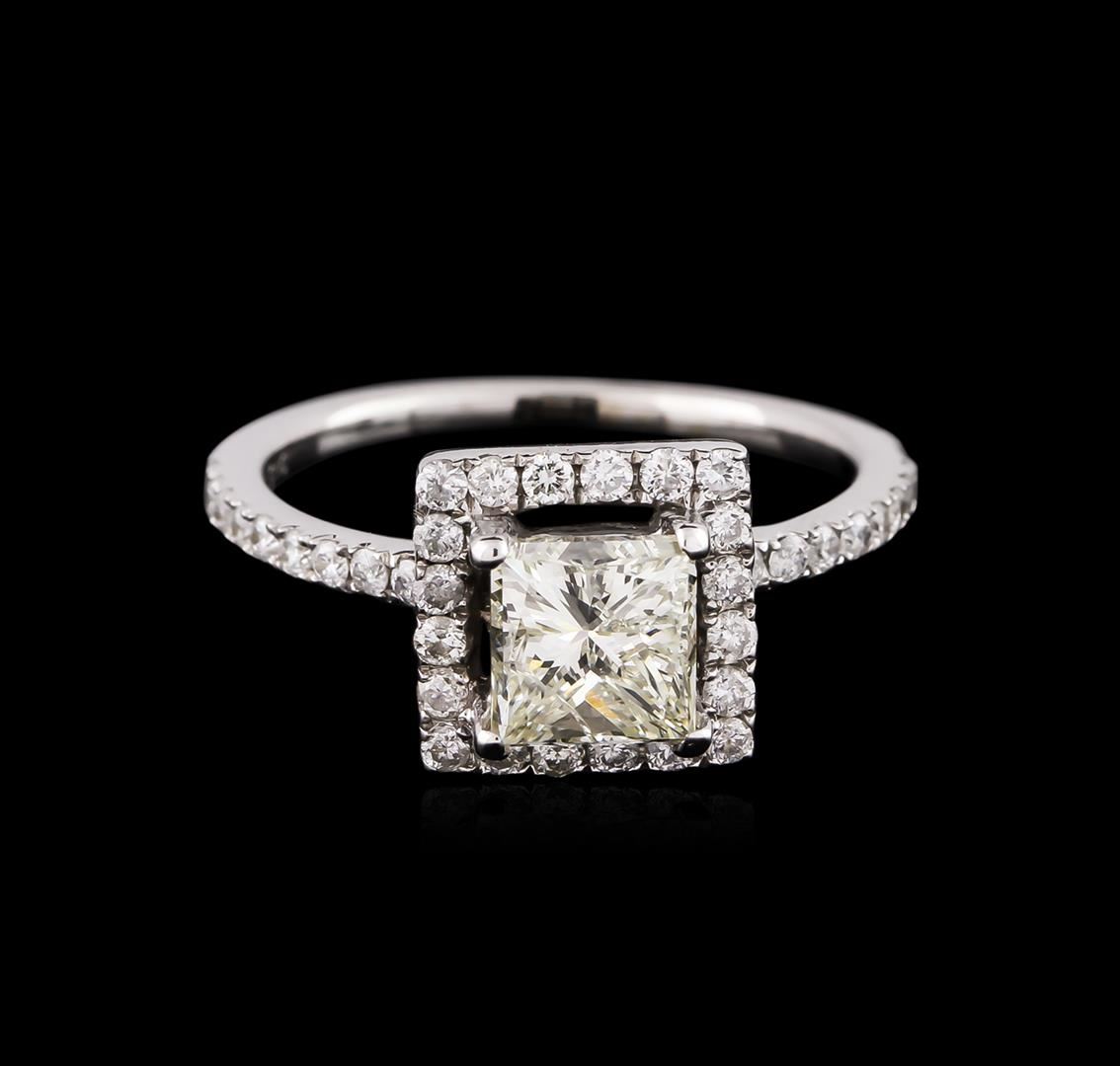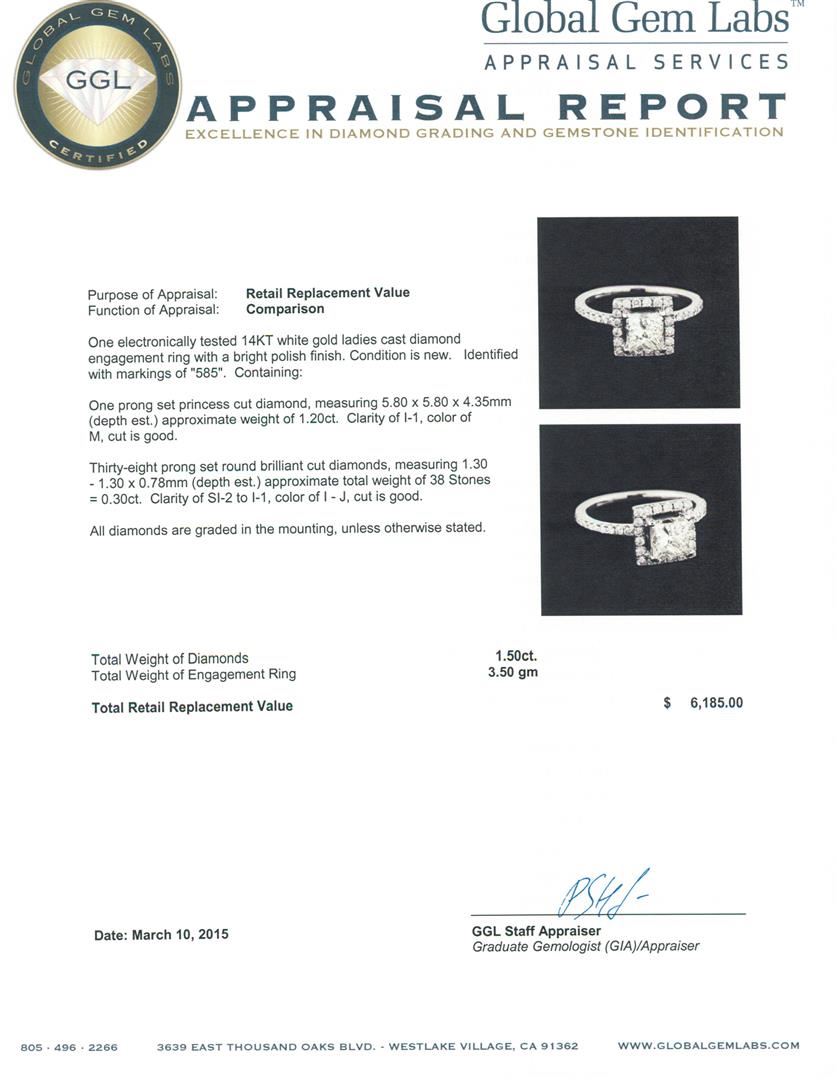 One electronically tested 14KT white gold ladies cast diamond engagement ring with a bright polish finish. Identified with markings of "585". Condition is new. Containing: One prong set princess cut diamond, measuring 5.80 x 5.80 x 4.35mm (depth est.) approximate weight of 1.20ct. Clarity: I-1. Color: M, Cut is Good. Thirty-Eight prong set round brilliant cut diamonds, measuring 1.30 - 1.30 x 0.78mm (depth est.) approximate total weight of 38 Stones = 0.30ct. Clarity: SI-2 to I-1. Color: I - J, Cut is Good. All diamonds are graded in the mounting, unless otherwise stated. Total Weight of Diamonds 1.50ct. Total Weight of Engagement Ring 3.50 grams. GGL Appraised.