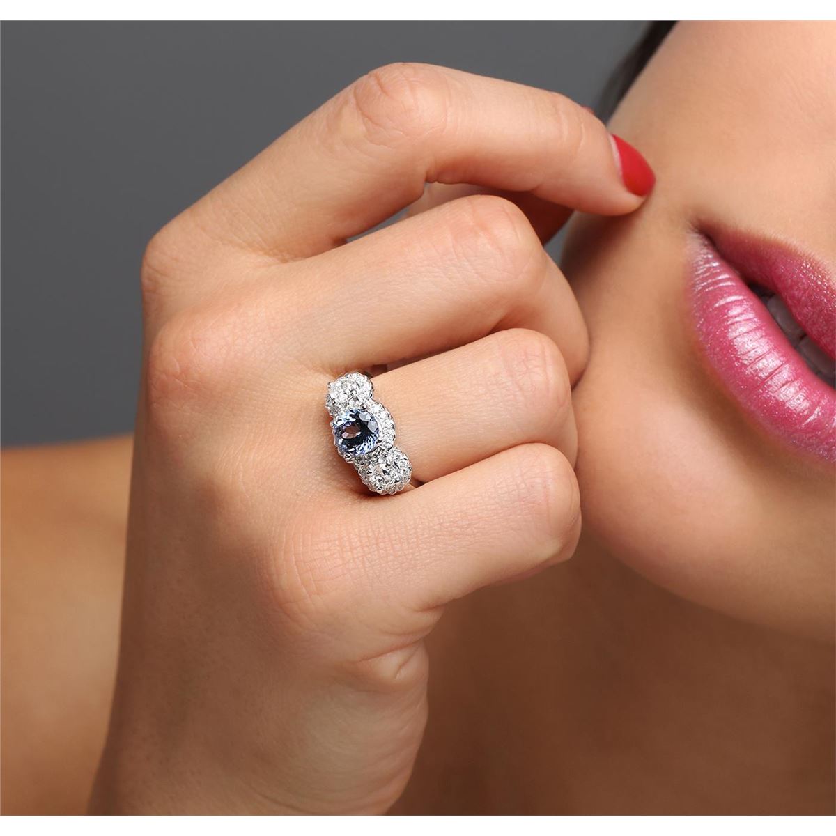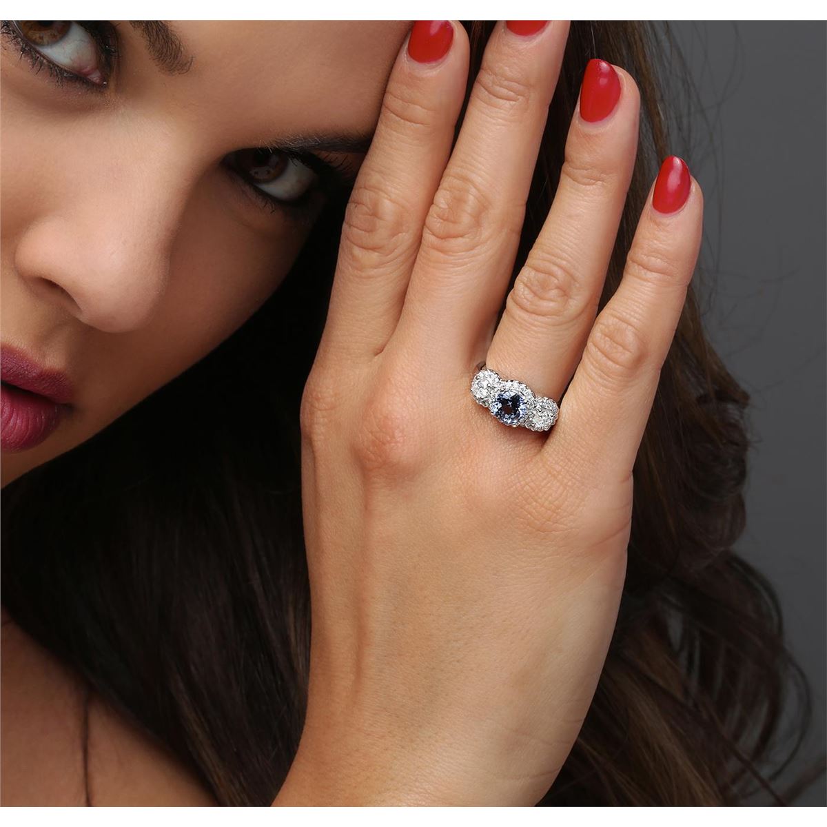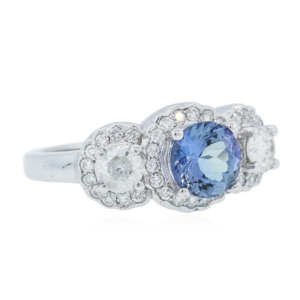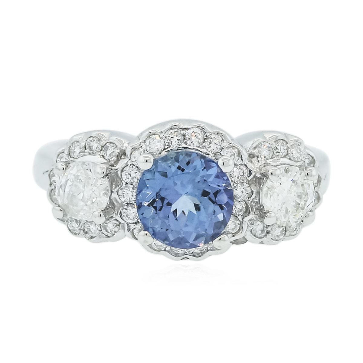 One electronically tested 14KT white gold ladies cast tanzanite and diamond ring with a bright polish finish. Identified with markings of "K14". Condition is new. Containing: One prong set round modified brilliant cut natural tanzanite, measuring 7.04 - 6.89 x 4.53 mm, approximate weight of 1.50ct., clarity is eye clean, type I, medium light, very slightly grayish, violet color, (GIA V 4/3), cut is good. Two prong set round brilliant cut diamonds, measuring 4.30 - 4.30 x 2.58mm (depth est.) approximate total weight of 2 Stones = 0.58ct. Clarity: I-1 to I-2. Color: I - J, Cut is Good. Thirty-Eight prong set round brilliant cut diamonds, measuring 1.30 - 1.30 x 0.78mm (depth est.) approximate total weight of 38 Stones = 0.30ct. Clarity: SI-2 to I-1. Color: I - J, Cut is Good. Colored gemstones are presumed to have been subjected to commonly used enhancement processes. All diamonds and colored gemstones are graded in the mounting, unless otherwise stated. Total Weight of Colored Stones 1.50ct. Total Weight of Diamonds 0.89ct. Total Weight of Ring 5.90 grams. GGL Appraised at $5,385.00.