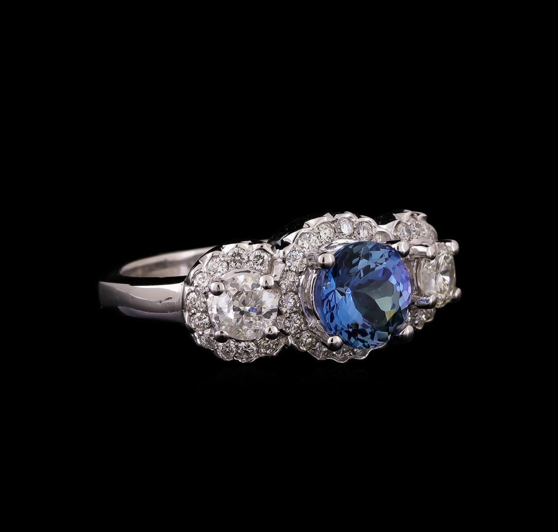 One electronically tested 14KT white gold ladies cast tanzanite and diamond ring with a bright polish finish. Identified with markings of "K14". Condition is new. Containing: One prong set round modified brilliant cut natural tanzanite, measuring 7.04 - 6.89 x 4.53 mm, approximate weight of 1.50ct., clarity is eye clean, type I, medium light, very slightly grayish, violet color, (GIA V 4/3), cut is good. Two prong set round brilliant cut diamonds, measuring 4.30 - 4.30 x 2.58mm (depth est.) approximate total weight of 2 Stones = 0.58ct. Clarity: I-1 to I-2. Color: I - J, Cut is Good. Thirty-Eight prong set round brilliant cut diamonds, measuring 1.30 - 1.30 x 0.78mm (depth est.) approximate total weight of 38 Stones = 0.30ct. Clarity: SI-2 to I-1. Color: I - J, Cut is Good. Colored gemstones are presumed to have been subjected to commonly used enhancement processes. All diamonds and colored gemstones are graded in the mounting, unless otherwise stated. Total Weight of Colored Stones 1.50ct. Total Weight of Diamonds 0.89ct. Total Weight of Ring 5.90 grams. GGL Appraised.