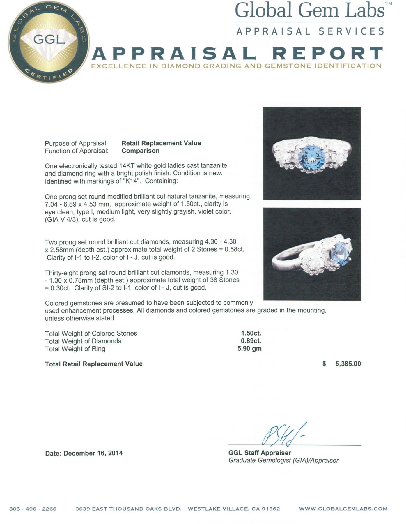 One electronically tested 14KT white gold ladies cast tanzanite and diamond ring with a bright polish finish. Identified with markings of "K14". Condition is new. Containing: One prong set round modified brilliant cut natural tanzanite, measuring 7.04 - 6.89 x 4.53 mm, approximate weight of 1.50 ct., clarity is eye clean, type I, medium light, very slightly grayish, violet color, (GIA V 4/3), cut is good. Two prong set round brilliant cut diamonds, measuring 4.30 - 4.30 x 2.58mm (depth est.) approximate total weight of 2 Stones = 0.58ct. Clarity: I-1 to I-2. Color: I - J, Cut is Good. Thirty-Eight prong set round brilliant cut diamonds, measuring 1.30 - 1.30 x 0.78mm (depth est.) approximate total weight of 38 Stones = 0.30 ct. Clarity: SI-2 to I-1. Color: I - J, Cut is Good. Colored gemstones are presumed to have been subjected to commonly used enhancement processes. All diamonds and colored gemstones are graded in the mounting, unless otherwise stated. Total Weight of Colored Stones 1.50 ct. Total Weight of Diamonds 0.89ct. Total Weight of Ring 5.90 grams. GGL Appraised.