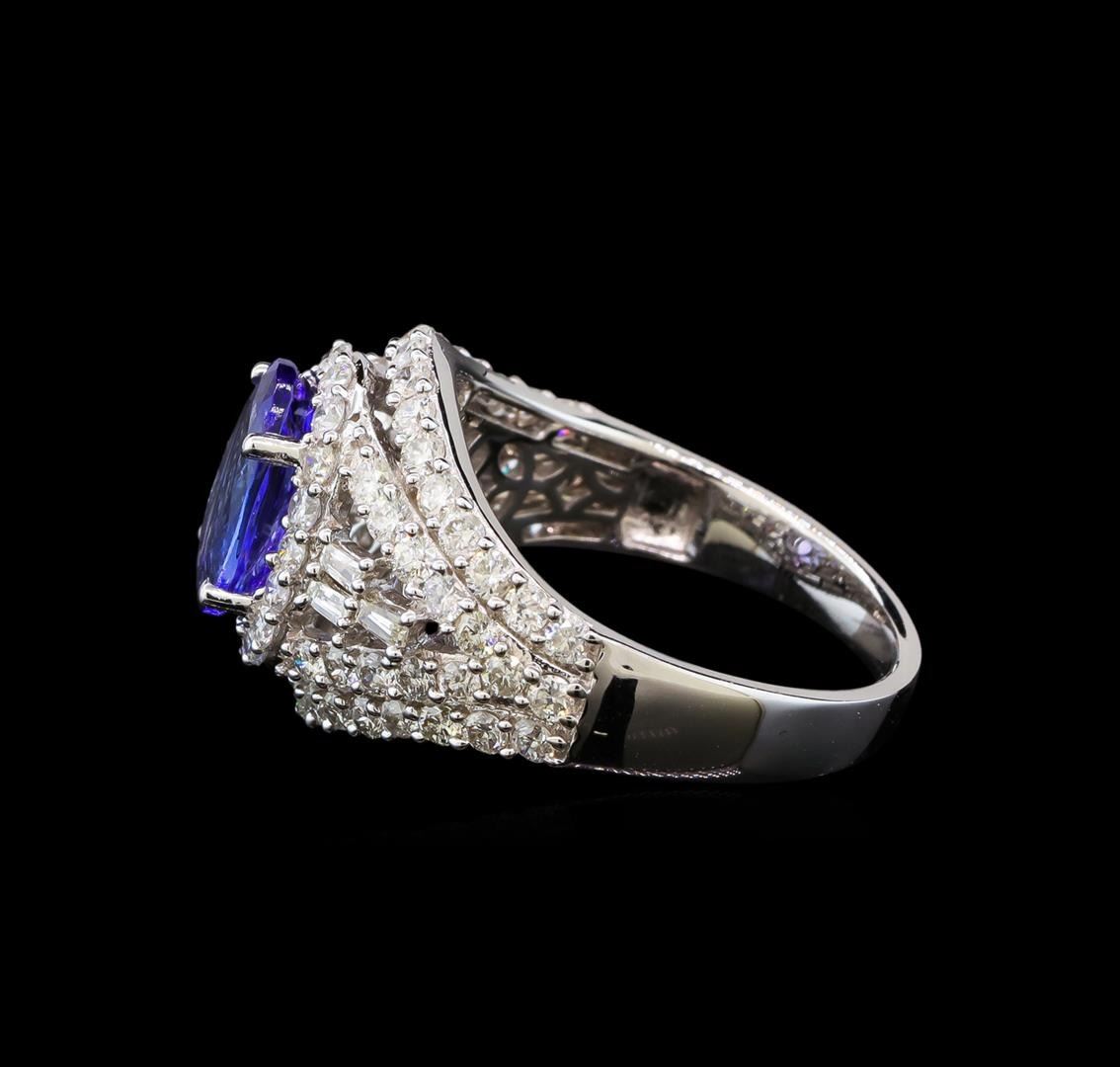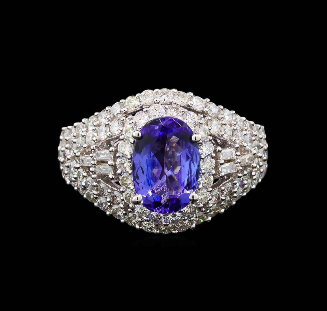 One electronically tested 14KT white gold ladies cast tanzanite and diamond ring with a tapered shank with a bright polish finish. Trademark is Orianne. Identified with markings of "14K". Condition is new. Containing: One prong set oval modified brilliant cut natural tanzanite, measuring 9.51 x 6.57 x 3.41mm, approximate weight of 1.50 ct., clarity is eye clean, type I, light, very slightly grayish, bluish violet color, (GIA bV 3/3), cut is good. Seventy-Six prong set round brilliant cut diamonds, measuring 1.30 - 1.30 x 0.78mm (depth est.) approximate total weight of 76 Stones = 0.61ct. Clarity: SI-2 to I-2. Color: I - J. Six prong set baguette cut diamonds, measuring from 1.50 x 1.10 x 0.94mm (depth est.) to 1.80 x 1.10 x 0.94mm (depth est.) approximate total weight of 6 Stones = 0.09ct. Clarity: SI-1. Color: I - J. All diamonds and colored gemstones are graded in the mounting, unless otherwise stated. Colored gemstones are presumed to have been subjected to commonly used enhancement processes. Total Weight of Colored Stones 1.50 ct. Total Weight of Diamonds 0.70 ct. Total Weight of Ring 5.50 grams. GGL Appraised.