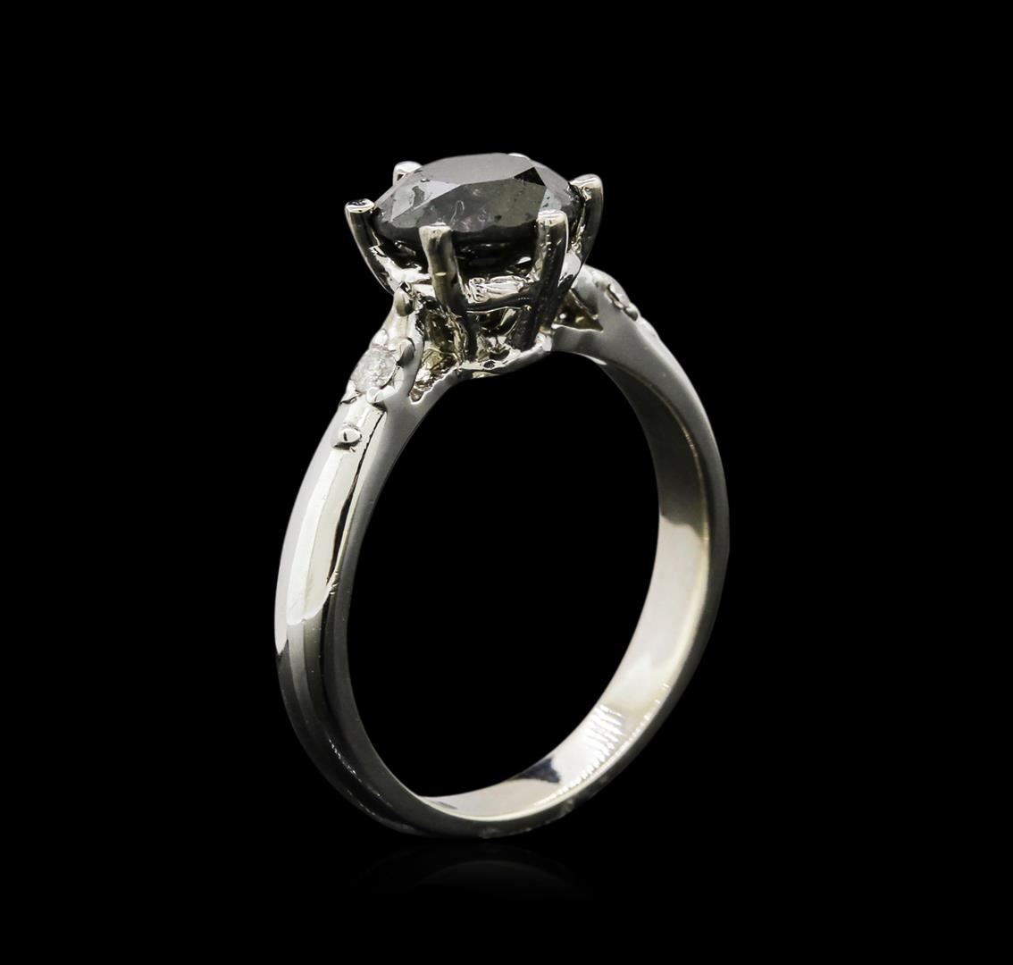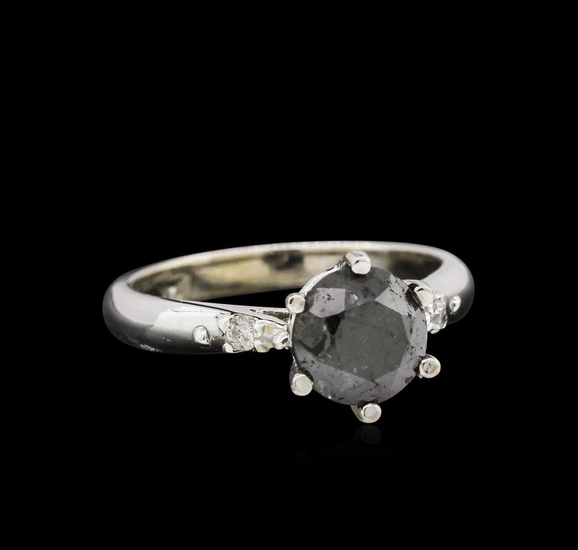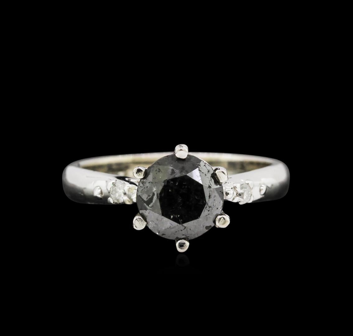 One electronically tested 14KT white gold ladies cast black and white diamond ring with a bright finish. Condition is new, good workmanship. The cathedral set black diamond is accented by a single white diamond on either side completed by a two and one-half millimeter wide band. Identified with the markings of "14K". Containing: prong set round brilliant cut diamond, measuring 7.20 - 7.15 x 4.50mm (depth est.), 6.00% GTCF approximate weight of 1.50ct. Indications of multiple laboratory enhancements. Graded in the setting. Clarity Declasse. Color fancy black; irradiated. Depth 62.6%. Table 59.8%. Two bead set round brilliant cut diamonds, measuring 1.90 - 1.90 x 1.14mm (depth est.) approximate total weight of 2 stones = 0.05ct. Graded in the setting. Clarity I-3. Color J. Total weight of diamonds 1.55ct. Total weight of ring 3.90gm. AIG Appraised at $1,960.00.