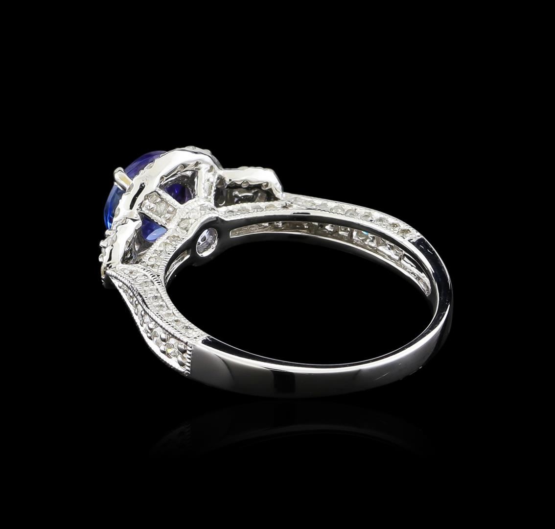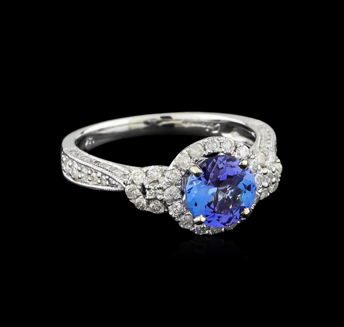 One electronically tested 14KT white gold ladies combination cast & assembled tanzanite and diamond ring with a flat shank with a bright polish finish. Identified with markings of "14K". Condition is new. Containing: One prong set round modified brilliant cut natural tanzanite, measuring 7.02 - 7.02 x 4.56 mm, approximate weight of 1.51ct., clarity is eye clean, type I, medium, very slightly grayish, violet color, (GIA V 5/3), cut is good. One Hundred Eight prong set round brilliant cut diamonds, measuring 1.50 - 1.00 x 0.75mm (depth est.) approximate total weight of 108 Stones = 0.50ct. Clarity: I-1 to I-2. Color: I - J, Cut is Good. Colored gemstones are presumed to have been subjected to commonly used enhancement processes. All diamonds and colored gemstones are graded in the mounting, unless otherwise stated. Total Weight of Colored Stones 1.51ct. Total Weight of Diamonds 0.50ct. Total Weight of Ring 3.50 grams. GGL Appraised at $4,255.00.