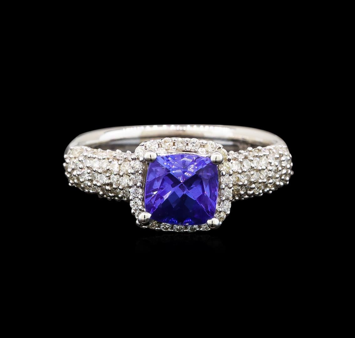 One electronically tested 14KT white gold ladies cast tanzanite and diamond ring with a flat shank with rounded edges with a bright polish finish. Trademark is Orianne. Identified with markings of "14K". Condition is new. Containing: One prong set square cushion modified brilliant cut natural tanzanite, measuring 6.50 x 6.47 x 4.55mm, approximate weight of 1.51ct., clarity is eye clean, type I, medium light, very slightly grayish, violet color, (GIA V 4/3), cut is good. One Hundred Twenty-Two prong set round brilliant cut diamonds, measuring 1.10 - 1.10 x 0.66mm (depth est.) approximate total weight of 122 Stones = 0.59ct. Clarity: I-1 to I-2. Color: I - J. All diamonds and colored gemstones are graded in the mounting, unless otherwise stated. Colored gemstones are presumed to have been subjected to commonly used enhancement processes.. Total Weight of Colored Stones 1.51ct. Total Weight of Diamonds 0.59ct. Total Weight of Ring 5.70 grams. GGL Appraised at $3,280.00.