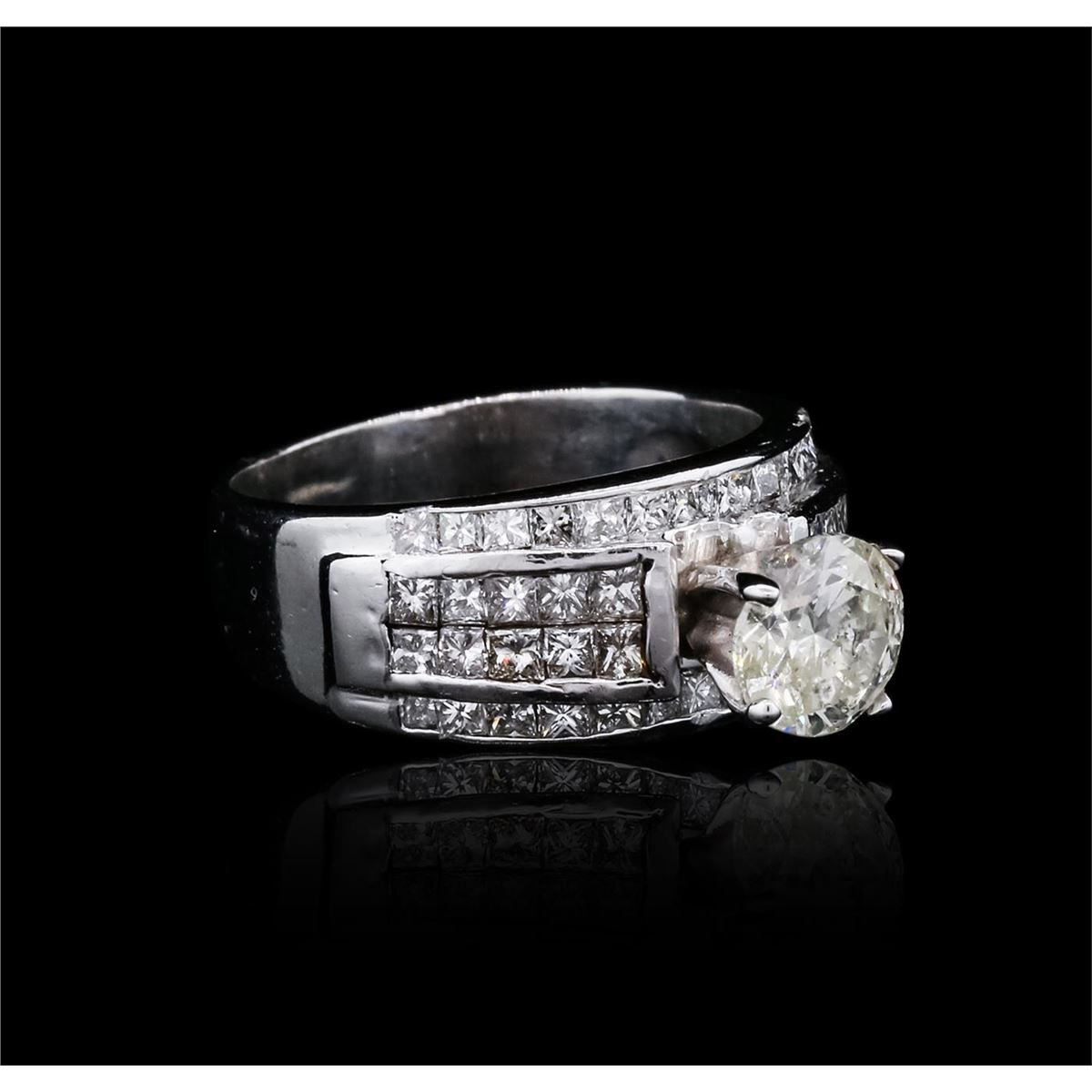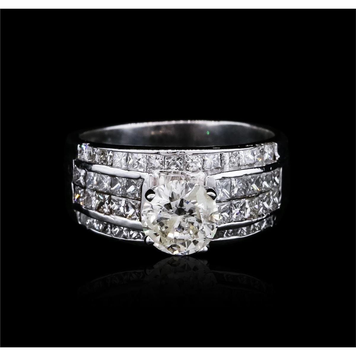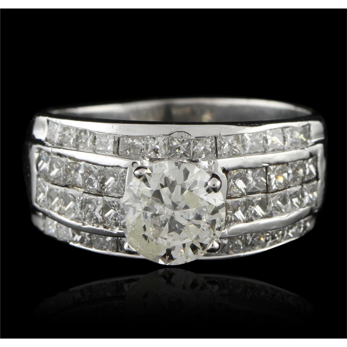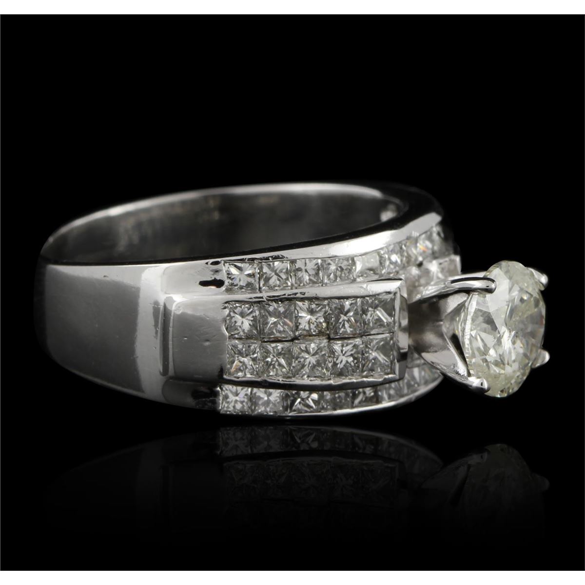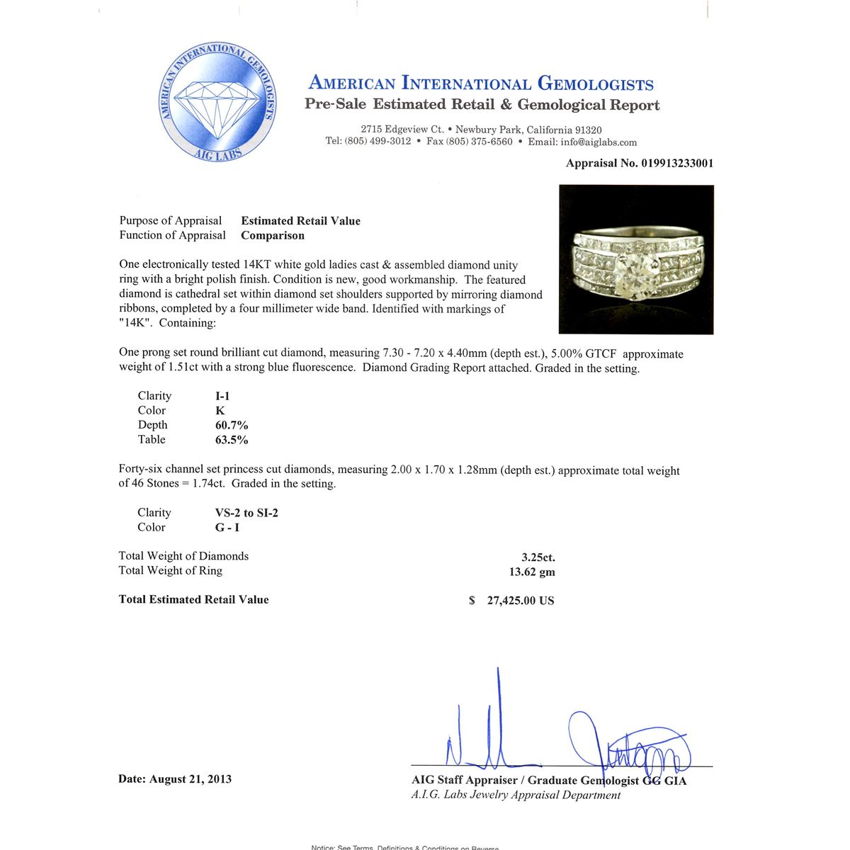 One electronically tested 14KT white gold ladies cast & assembled diamond unity ring with a bright polish finish. Condition is new, good workmanship. The featured diamond is cathedral set within diamond set shoulders supported by mirroring diamond ribbons, completed by a four millimeter wide band. Identified with markings of "14K". Containing: One prong set round brilliant cut diamond, measuring 7.30 - 7.20 x 4.40mm (depth est.), 5.00% GTCF approximate weight of 1.51ct with a strong blue fluorescence. Diamond Grading Report attached. Graded in the setting. Clarity I-1. Color K. Depth 60.7%. Table 63.5%. Forty-six channel set princess cut diamonds, measuring 2.00 x 1.70 x 1.28mm (depth est.) approximate total weight of 46 Stones = 1.74ct. Graded in the setting. Clarity VS-2 to SI-2. Color G - I. Total Weight of Diamonds 3.25ct. Total Weight of Ring 13.62gm. AIG Appraised at $27,425.00.