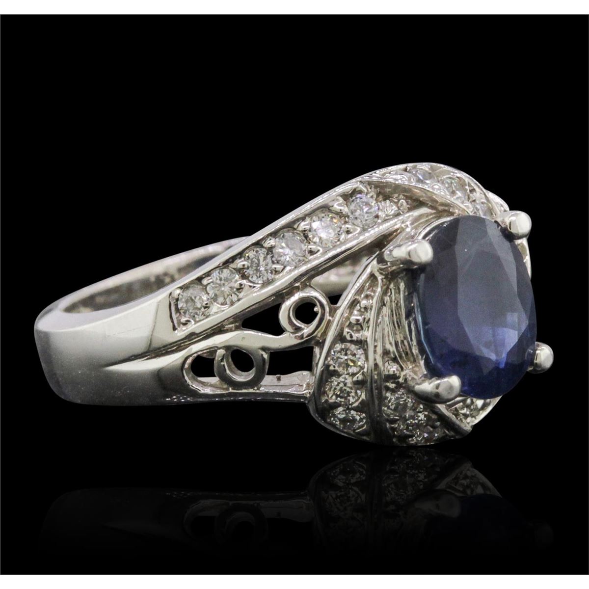 One electronically tested 14KT white gold ladies cast ring with a tapered shank with a bright polish finish. Identified with markings of "14K". Condition is new. Containing: One prong set oval modified brilliant cut natural blue sapphire, measuring 7.93 x 6.07 x 3.86mm, approximate weight of 1.51ct., clarity is heavily included, type II, medium dark, moderately strong, blue color, (GIA B 6/4), cut is good. Twenty-Four prong set round brilliant cut diamonds, measuring 1.50 - 1.50 x 0.90mm (depth est.) approximate total weight of 24 Stones = 0.30ct. Clarity: I-1 to I-2. Color: H - I, Cut is Good. Colored gemstones are presumed to have been subjected to commonly used enhancement processes, All diamonds and colored gemstones are graded in the mounting, unless otherwise stated. Total Weight of Colored Stones 1.51ct. Total Weight of Diamonds 0.30ct. Total Weight of Ring 6.00 grams. GGL Appraised at $3,290.00.