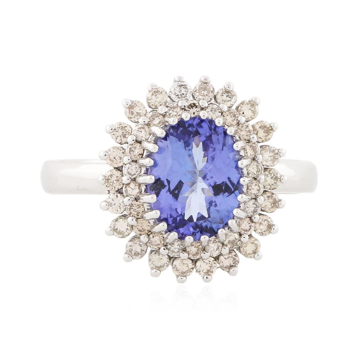 One electronically tested 14KT white gold ladies cast tanzanite and diamond ring with a bright polish finish. Condition is new, good workmanship. The featured tanzanite is set within tiered diamond bezels, completed by a two and one-half millimeter wide band. Identified with markings of "K14". Containing: One prong set oval mixed cut natural tanzanite, measuring 8.80 x 6.70 x 3.70mm, approximate weight of 1.51 ct., clarity is eye clean, type I, medium light, very slightly grayish, bluish violet color, (GIA bV 4/3), cut is good. Transmitting light with no distortion, transparent. Graded in the setting. Tanzanite is a very rare gemstone that is only found in the country of Tanzania. Originally discovered in 1967. Tiffany & Company, named the stone Tanzanite. It is found in the Usumburu Mountains that border the Umba Valley of northern Tanzania. Tanzanite occurs in gray, brown, violet, blue, reddish-purple, & green. The gem is interesting because of its exceptional pleochroism. Rotated in different directions a tanzanite will exhibit multiple changes of color. Tanzanite has a low tolerance to ultrasonic cleaning, and should not be cleaned using this method. Forty-four prong set round brilliant cut diamonds, measuring 1.50 - 1.30 x 0.84mm (depth est.) approximate total weight of 44 Stones = 0.52ct. Graded in the setting. Clarity VS-1 to SI-1. Color Very Light Brown. Total Weight of Colored Stones 1.51ct. Total Weight of Diamonds 0.52ct. Total Weight of Ring 4.66gm. AIG Appraised at $4,075.00.