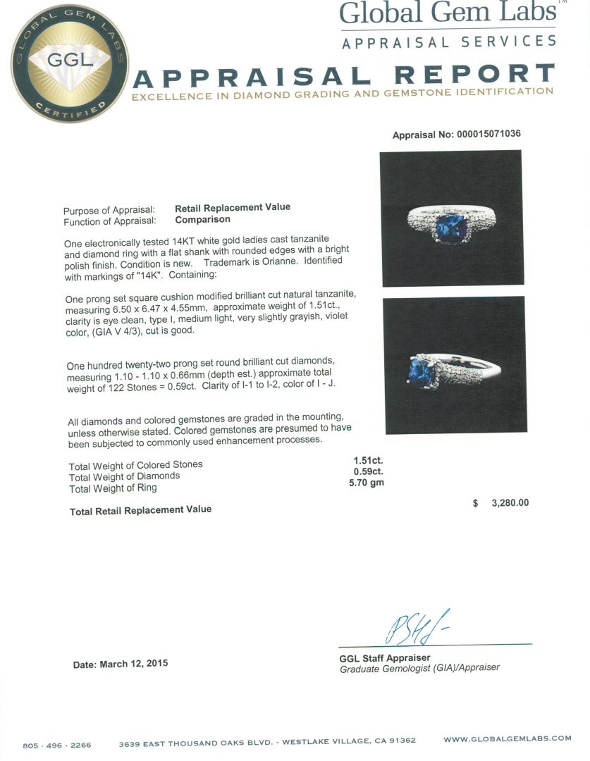 One electronically tested 14KT white gold ladies cast tanzanite and diamond ring with a flat shank with rounded edges with a bright polish finish. Trademark is Orianne. Identified with markings of "14K". Condition is new. Containing: One prong set square cushion modified brilliant cut natural tanzanite, measuring 6.50 x 6.47 x 4.55mm, approximate weight of 1.51ct., clarity is eye clean, type I, medium light, very slightly grayish, violet color, (GIA V 4/3), cut is good. One Hundred Twenty-Two prong set round brilliant cut diamonds, measuring 1.10 - 1.10 x 0.66mm (depth est.) approximate total weight of 122 Stones = 0.59ct. Clarity: I-1 to I-2. Color: I - J. All diamonds and colored gemstones are graded in the mounting, unless otherwise stated. Colored gemstones are presumed to have been subjected to commonly used enhancement processes.. Total Weight of Colored Stones 1.51ct. Total Weight of Diamonds 0.59ct. Total Weight of Ring 5.70 grams. GGL Appraised at $3,280.00.
