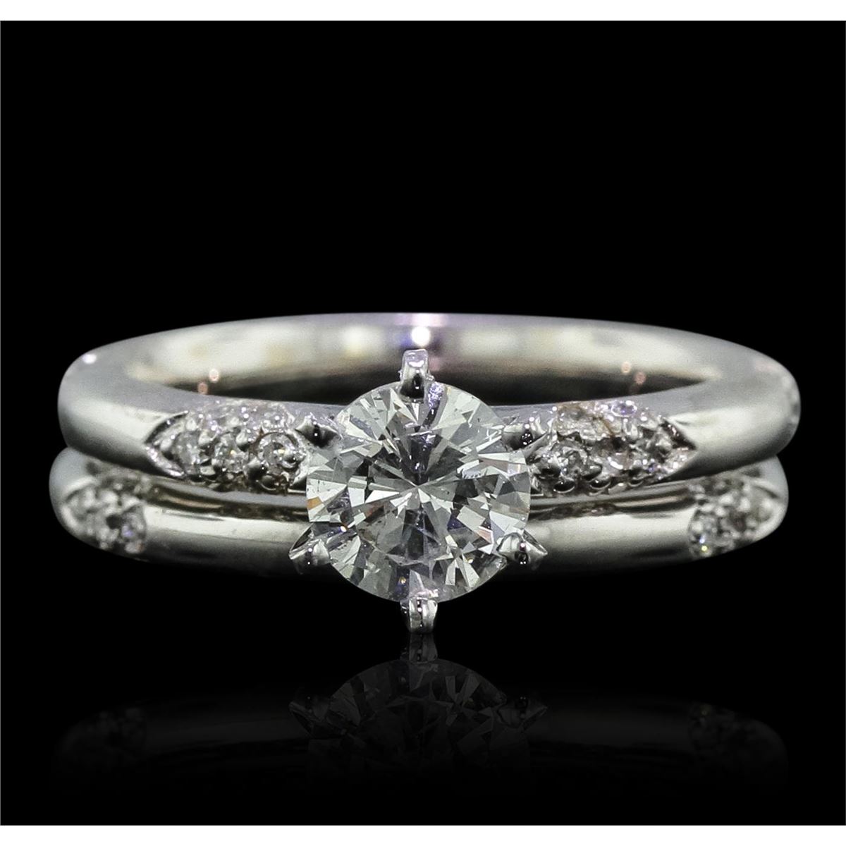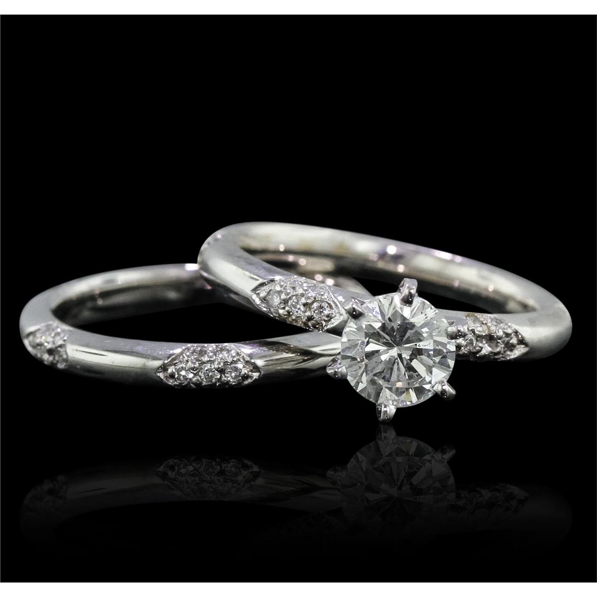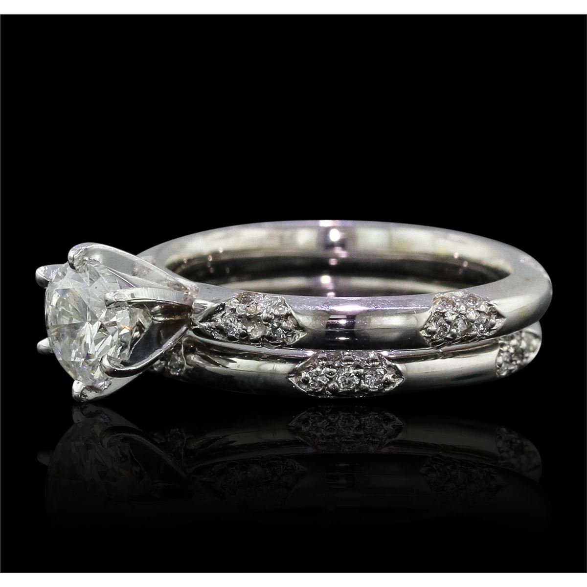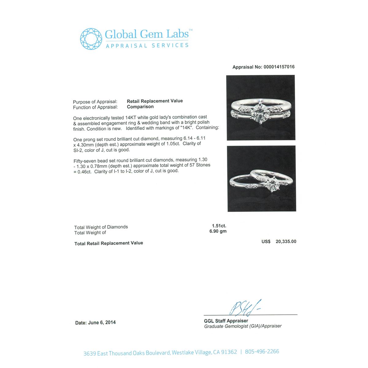 One electronically tested 14KT white gold Ladies combination cast & assembled engagement ring & wedding band with a bright polish finish. Condition is new. Identified with markings of "14K". Containing: One prong set round brilliant cut diamond, measuring 6.14 - 6.11 x 4.30mm (depth est.) approximate weight of 1.05ct. Clarity: SI-2. Color: J, Cut is Good. Fifty-Seven bead set round brilliant cut diamonds, measuring 1.30 - 1.30 x 0.78mm (depth est.) approximate. Total Weight of 57 Stones = 0.46ct. Clarity: I-1 to I-2. Color: J, Cut is Good. Total Weight of Diamonds 1.51ct. Total Weight of 6.90 grams. GGL Appraised at $20,335.00.