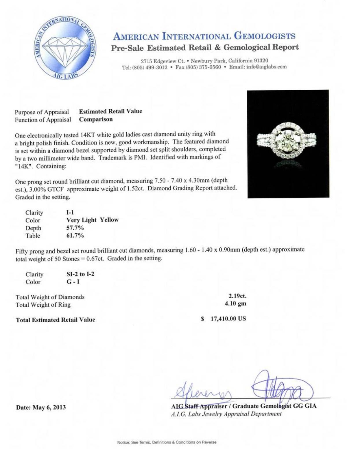 14KT White Gold 1.52ct I-1/Very Light Yellow Diamond Ring A4855. One electronically tested 14KT white gold ladies cast diamond unity ring with a bright polish finish. Condition is new, good workmanship. The featured diamond is set within a diamond bezel supported by diamond set split shoulders, completed by a two millimeter wide band. Trademark is PMI. Identified with markings of "14K". Containing: One prong set round brilliant cut diamond, measuring 7.50 - 7.40 x 4.30mm (depth est.), 3.00% GTCF approximate weight og 1.52ct. Diamond Grading Report attached. Graded in the setting. Clarity I-1. Color Very Light Yellow. Depth 57.7%. Table 61.7%. Fifty prong and bezel set round brilliant cut diamonds, measuring 1.60 - 1.40 x 0.90mm (depth est.) approximate total weight of 50 Stones = 0.67ct. Graded in the setting. Clarity SI-2 to I-2. Color G - I. Total weight of Diamonds 2.19ct. Total Weight of Ring 4.10 gm. AIG Appraised.