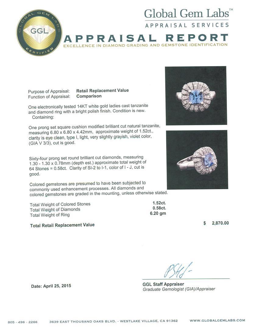 One electronically tested 14KT white gold ladies cast tanzanite and diamond ring with a bright polish finish. Condition is new. Containing: One prong set square cushion modified brilliant cut natural tanzanite, measuring 6.80 x 6.80 x 4.42mm, approximate weight of 1.52ct., clarity is eye clean, type I, light, very slightly grayish, violet color, (GIA V 3/3), cut is good. Sixty-Four prong set round brilliant cut diamonds, measuring 1.30 - 1.30 x 0.78mm (depth est.) approximate total weight of 64 Stones = 0.58ct. Clarity: SI-2 to I-1. Color: I - J, Cut is Good. Colored gemstones are presumed to have been subjected to commonly used enhancement processes. All diamonds and colored gemstones are graded in the mounting, unless otherwise stated. Total Weight of Colored Stones 1.52ct. Total Weight of Diamonds 0.58ct. Total Weight of Ring 6.20 grams. GGL Appraised.
