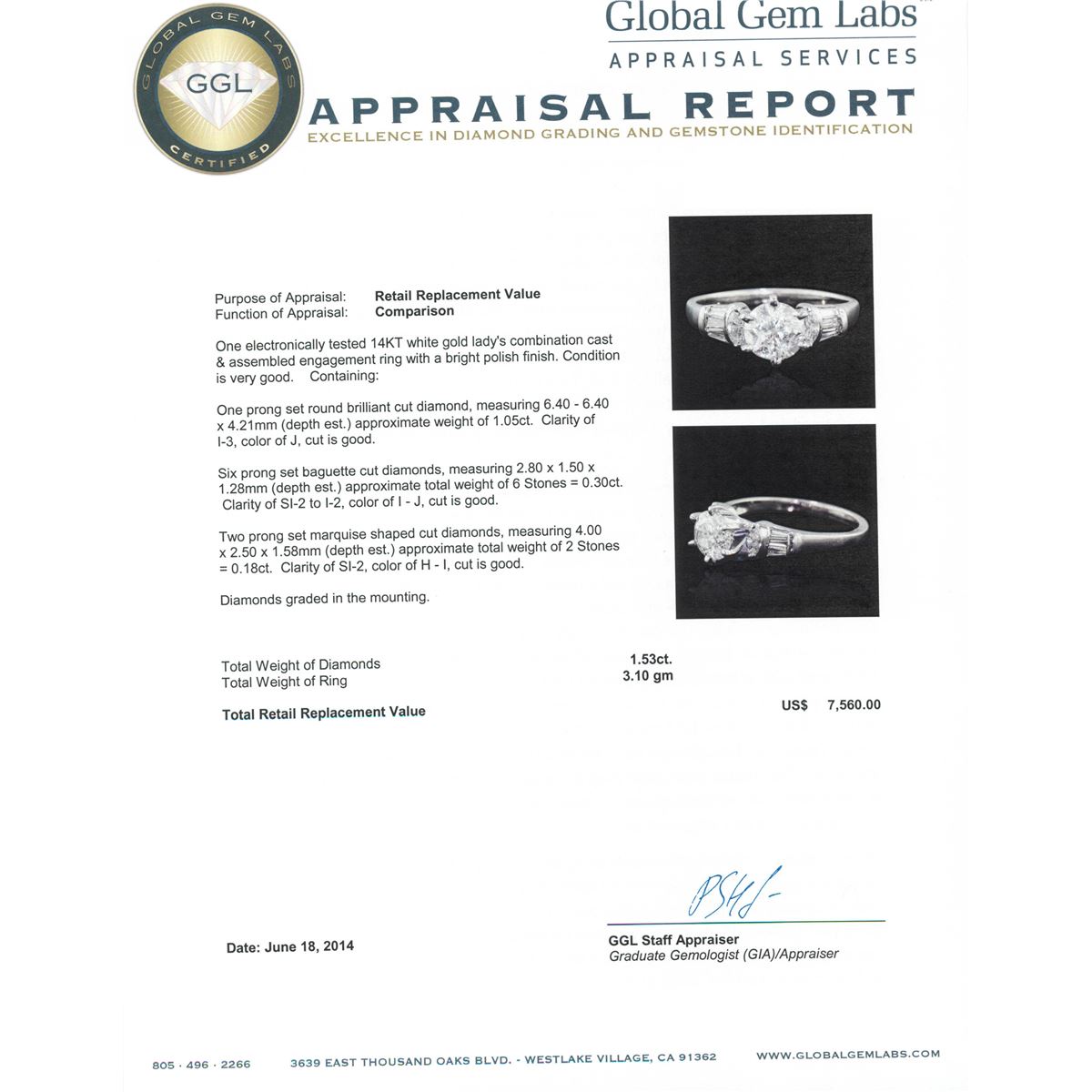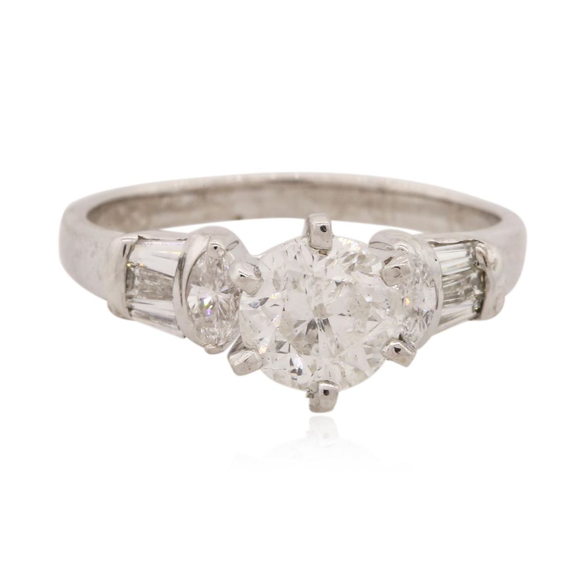 One electronically tested 14KT white gold Ladies combination cast & assembled engagement ring with a bright polish finish. Condition is very good. Containing: One prong set round brilliant cut diamond, measuring 6.40 - 6.40 x 4.21mm (depth est.) approximate weight of 1.05ct. Clarity: I-3. Color: J, Cut is Good. Six prong set baguette cut diamonds, measuring 2.80 x 1.50 x 1.28mm (depth est.) approximate. Total Weight of 6 Stones = 0.30ct. Clarity: SI-2 to I-2. Color: I - J, Cut is Good. Two prong set marquise shaped cut diamonds, measuring 4.00 x 2.50 x 1.58mm (depth est.) approximate. Total Weight of 2 Stones = 0.18ct. Clarity: SI-2. Color: H - I, Cut is Good. Diamonds graded in the mounting. Total Weight of Diamonds 1.53ct. Total Weight of Ring 3.10 grams. GGL Appraised at $7,560.00.