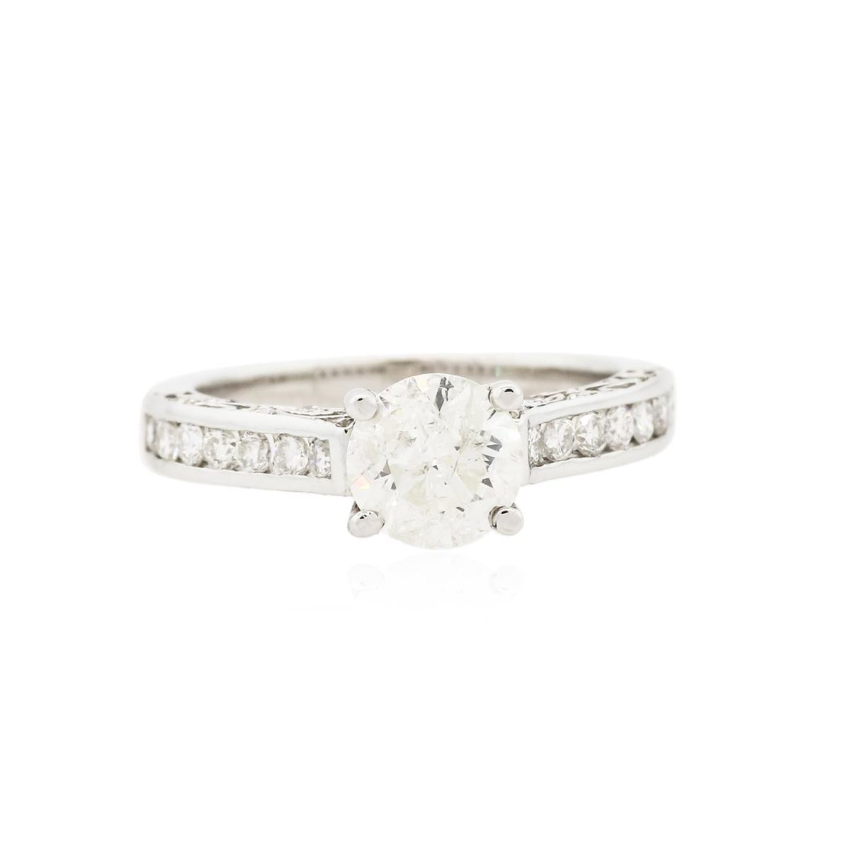 One electronically tested 14KT white gold Ladies combination cast & assembled engagement ring with a bright polish finish. Condition is new. Identified with markings of "14K". Containing: One prong set round brilliant cut diamond, measuring 6.53 - 6.51 x 4.17mm (depth est.) approximate weight of 1.10ct. Clarity: I-1. Color: G, Cut is Good. Twenty-Nine prong set round brilliant cut diamonds, measuring 1.60 - 1.60 x 0.96mm (depth est.) approximate. Total Weight of 29 Stones = 0.43ct. Clarity: SI-1 to SI-2. Color: F - G, Cut is Good. EGL USA GEM ID# US 911348411D. All diamonds are graded in the mounting, unless otherwise stated. Total Weight of Diamonds 1.53ct. Total Weight of Engagement Ring 3.20 grams. GGL Appraised at $20,635.00.
