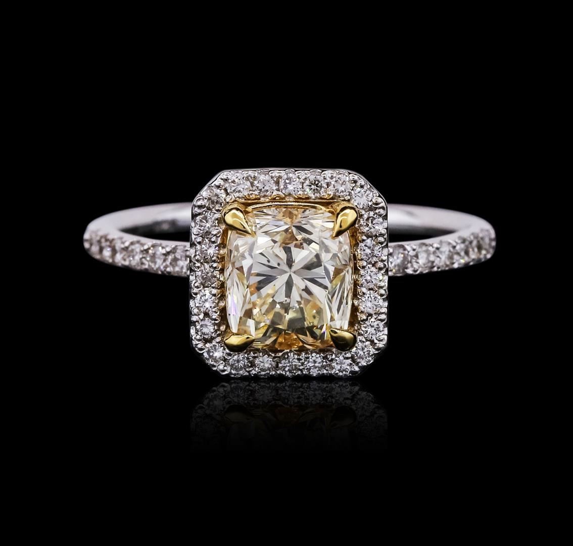 Great Condition! KJ1574YT. One electronically tested 14KT white gold ladies cast diamond unity ring with a bright polish finish. Condition is new, good workmanship. The featured diamond is within a yellow gold basket and place within a diamond bezel. The ring is supported by diamond set shoulders, completed by a one and one-half millimeter wide band. Identified with markings of "14K". Containing: One prong set cushion cut diamond, measuring 6.63 x 5.96 x 5.10mm exact weight 1.53ct with a faint fluorescence. Graded loose prior to setting in the GIA Laboratory, Report #2145972182. Clarity SI-1. Color U - V. Depth 85.6%. Table 63.0%. Thirty-eight prong set round brilliant cut diamonds, measuring 1.40 - 1.20 x 0.78mm (depth est.) approximate total weight of 38 Stones = 0.31ct. Graded in the setting. Clarity VS-VS-1 to VS- 2. Color G - I. Total Weight of Diamonds 1.84ct. Total Weight of Ring 3.14gm. AIG Appraised at $14,625.00. GIA Appraised.