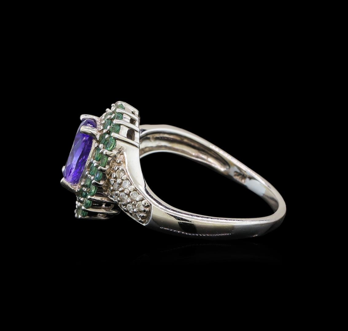 One electronically tested 14KT white gold ladies cast tanzanite, emerald and diamond ring with a bright polish finish. Identified with markings of "14K". Condition is new. Containing: One prong set oval modified brilliant cut natural tanzanite, measuring 9.30 x 6.00 x 3.91mm, approximate weight of 1.53ct., clarity is eye clean, type I, medium light, slightly grayish, violet color, (GIA V 4/2), cut is good. Thirty-seven prong set round modified brilliant cut natural emeralds, measuring 1.50 - 1.50 x 0.98 mm, approximate total weight of 0.37ct., clarity is slightly included, type III, medium, very slightly grayish, green color, (GIA G 5/3), cut is good. Twenty prong set round brilliant cut diamonds, measuring 1.20 - 1.20 x 0.72mm (depth est.) approximate total weight of 20 Stones = 0.13ct. Clarity: I-1 to I-2. Color: I - J, Cut is Good. Colored gemstones are presumed to have been subjected to commonly used enhancement processes. All diamonds and colored gemstones are graded in the mounting, unless otherwise stated. Total Weight of Colored Stones 1.90ct. Total Weight of Diamonds 0.13ct. Total Weight of Ring 4.20 grams. GGL Appraised at $2,030.00.