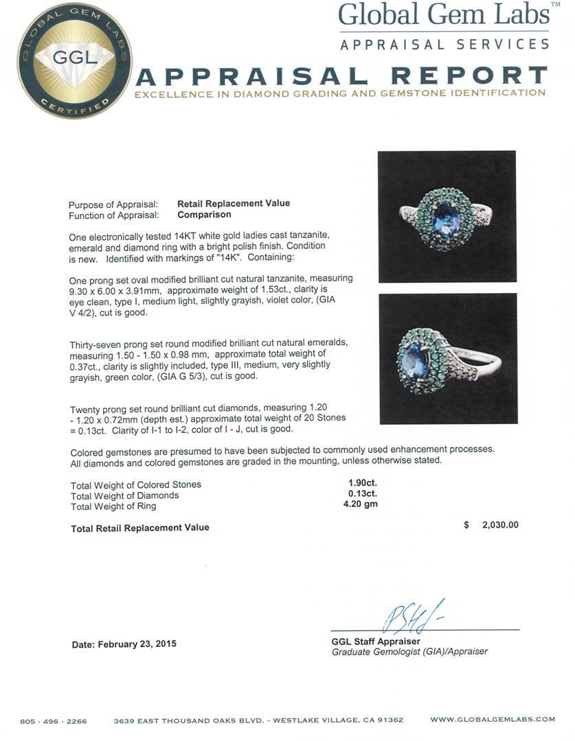 One electronically tested 14KT white gold ladies cast tanzanite, emerald and diamond ring with a bright polish finish. Identified with markings of "14K". Condition is new. Containing: One prong set oval modified brilliant cut natural tanzanite, measuring 9.30 x 6.00 x 3.91mm, approximate weight of 1.53ct., clarity is eye clean, type I, medium light, slightly grayish, violet color, (GIA V 4/2), cut is good. Thirty-seven prong set round modified brilliant cut natural emeralds, measuring 1.50 - 1.50 x 0.98 mm, approximate total weight of 0.37ct., clarity is slightly included, type III, medium, very slightly grayish, green color, (GIA G 5/3), cut is good. Twenty prong set round brilliant cut diamonds, measuring 1.20 - 1.20 x 0.72mm (depth est.) approximate total weight of 20 Stones = 0.13ct. Clarity: I-1 to I-2. Color: I - J, Cut is Good. Colored gemstones are presumed to have been subjected to commonly used enhancement processes. All diamonds and colored gemstones are graded in the mounting, unless otherwise stated. Total Weight of Colored Stones 1.90ct. Total Weight of Diamonds 0.13ct. Total Weight of Ring 4.20 grams. GGL Appraised at $2,030.00.