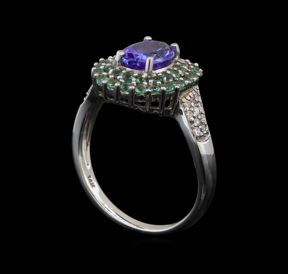 One electronically tested 14KT white gold ladies cast tanzanite, emerald and diamond ring with a bright polish finish. Identified with markings of "14K". Condition is new. Containing: One prong set oval modified brilliant cut natural tanzanite, measuring 9.30 x 6.00 x 3.91mm, approximate weight of 1.53ct., clarity is eye clean, type I, medium light, slightly grayish, violet color, (GIA V 4/2), cut is good. Thirty-seven prong set round modified brilliant cut natural emeralds, measuring 1.50 - 1.50 x 0.98 mm, approximate total weight of 0.37ct., clarity is slightly included, type III, medium, very slightly grayish, green color, (GIA G 5/3), cut is good. Twenty prong set round brilliant cut diamonds, measuring 1.20 - 1.20 x 0.72mm (depth est.) approximate total weight of 20 Stones = 0.13ct. Clarity: I-1 to I-2. Color: I - J, Cut is Good. Colored gemstones are presumed to have been subjected to commonly used enhancement processes. All diamonds and colored gemstones are graded in the mounting, unless otherwise stated. Total Weight of Colored Stones 1.90 ct. Total Weight of Diamonds 0.13ct. Total Weight of Ring 4.20 grams. GGL Appraised.