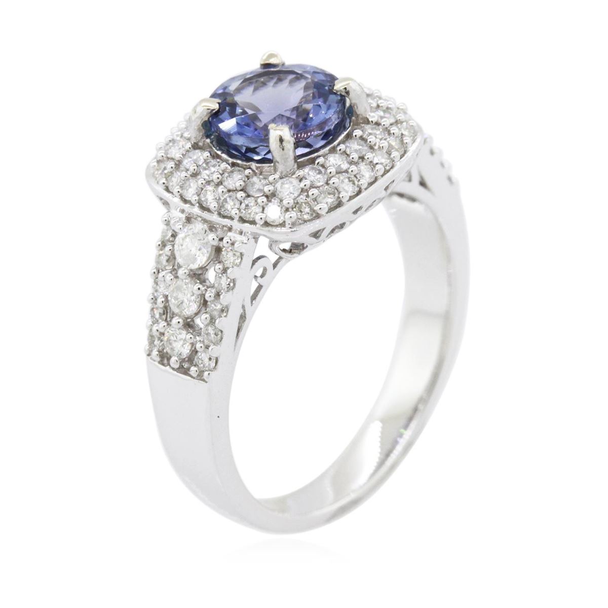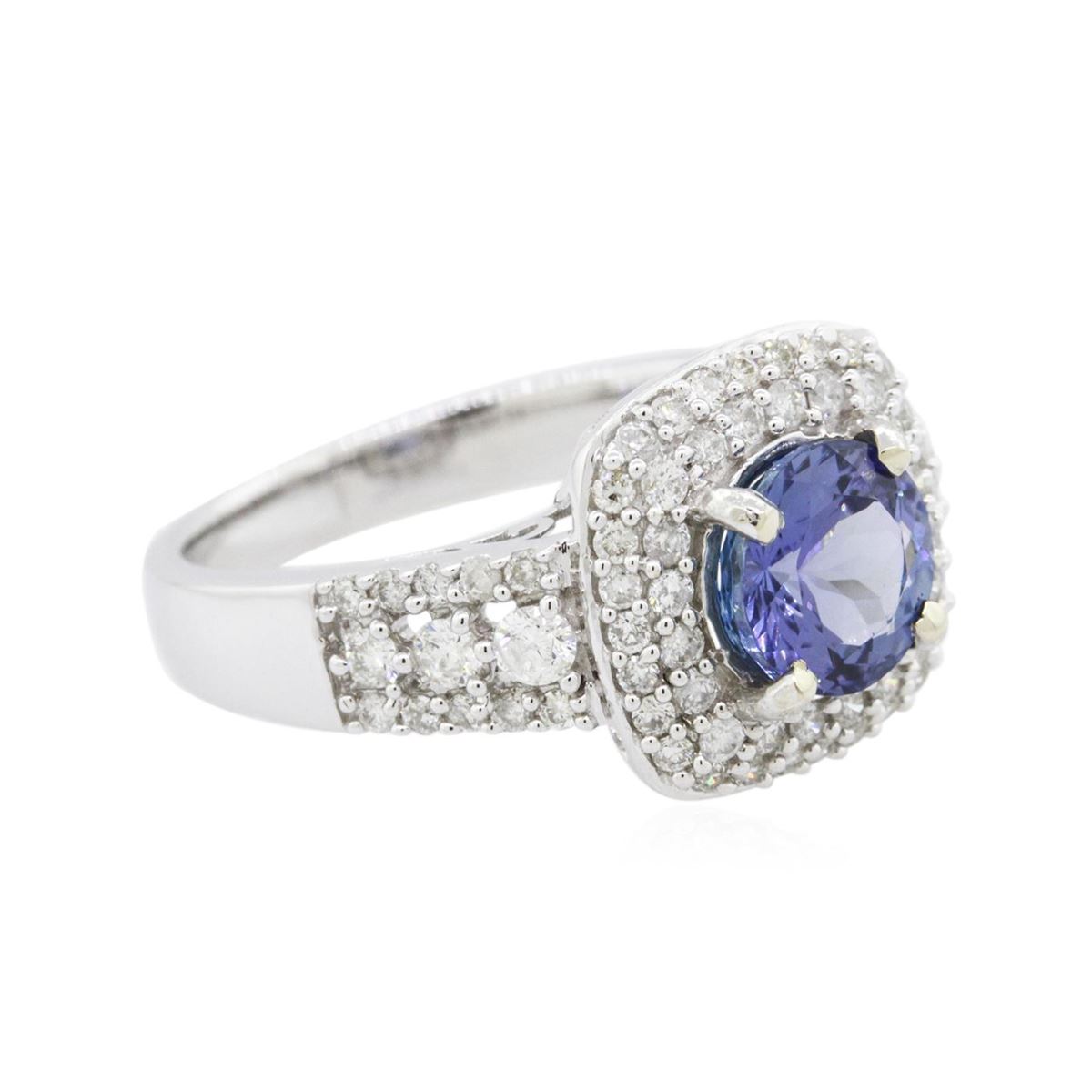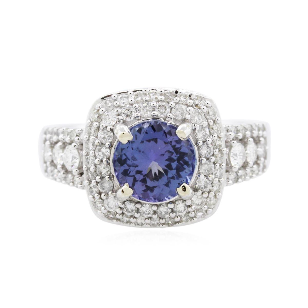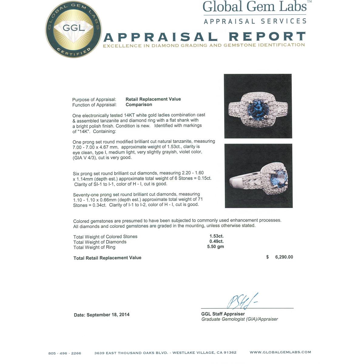 One electronically tested 14KT white gold ladies combination cast & assembled tanzanite and diamond ring with a flat shank with a bright polish finish. Identified with markings of "14K". Condition is new. Containing: One prong set round modified brilliant cut natural tanzanite, measuring 7.00 - 7.00 x 4.67 mm, approximate weight of 1.53ct., clarity is eye clean, type I, medium light, very slightly grayish, violet color, (GIA V 4/3), cut is very good. Six prong set round brilliant cut diamonds, measuring 2.20 - 1.60 x 1.14mm (depth est.) approximate total weight of 6 Stones = 0.15ct. Clarity: SI-1 to I-1. Color: H - I, Cut is Good. Seventy-One prong set round brilliant cut diamonds, measuring 1.10 - 1.10 x 0.66mm (depth est.) approximate total weight of 71 Stones = 0.34ct. Clarity: I-1 to I-2. Color: H - I, Cut is Good. Colored gemstones are presumed to have been subjected to commonly used enhancement processes. All diamonds and colored gemstones are graded in the mounting, unless otherwise stated. Total Weight of Colored Stones 1.53ct. Total Weight of Diamonds 0.49ct. Total Weight of Ring 5.50 grams. GGL Appraised at $6,290.00.