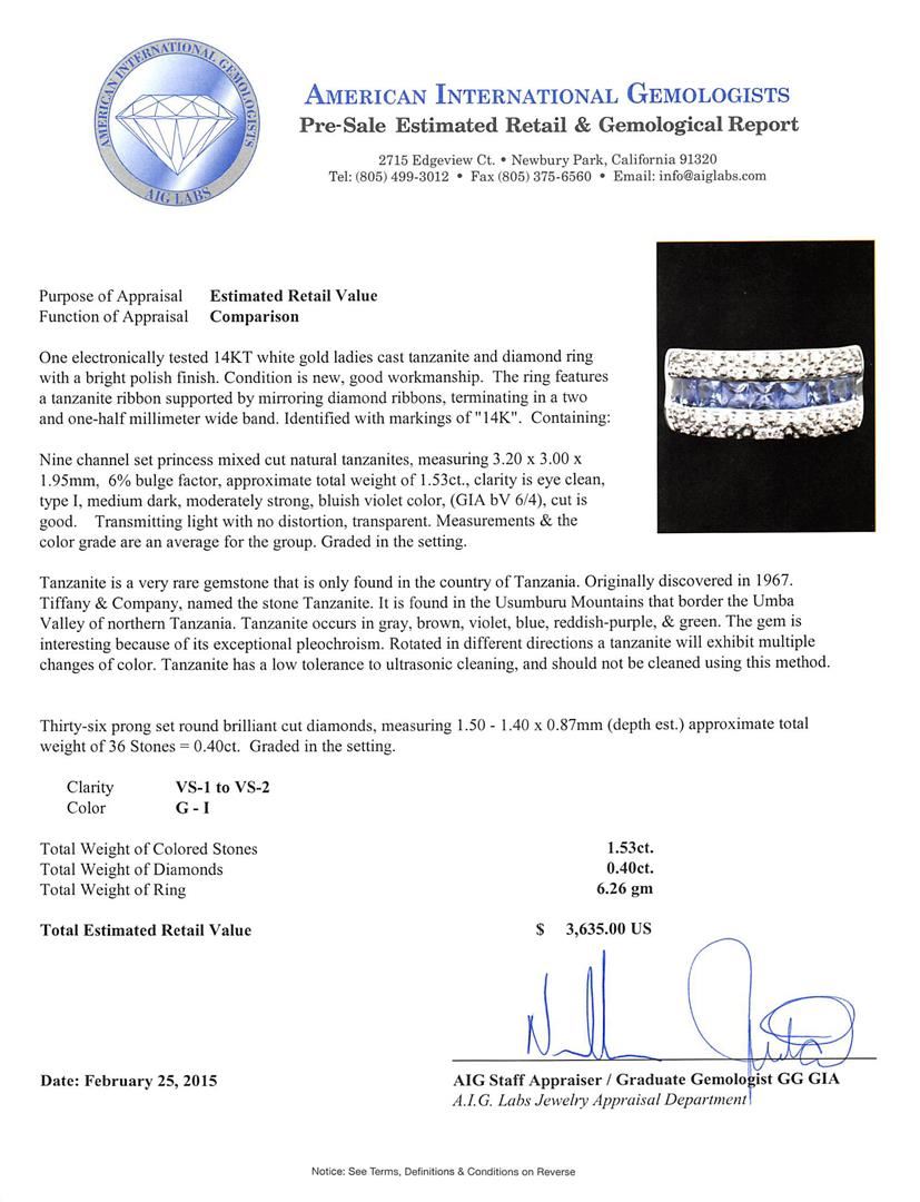 One electronically tested 14KT white gold ladies cast tanzanite and diamond ring with a bright polish finish. The ring features a tanzanite ribbon supported by mirroring diamond ribbons, terminating in a two and one-half millimeter wide band. Identified with markings of "14K". Condition is new, good workmanship. Containing: Nine channel set princess mixed cut natural tanzanites, measuring 3.20 x 3.00 x 1.95mm, 6%. bulge factor, approximate total weight of 1.53ct., clarity is eye clean, type I, medium dark, moderately strong, bluish violet color, (GIA bV 6/4), cut is good. Transmitting light with no distortion, transparent. Measurements & the color grade are an average for the group. Graded in the setting. Tanzanite is a very rare gemstone that is only found in the country of Tanzania. Originally discovered in 1967. Tiffany & Company, named the stone Tanzanite. It is found in the Usumburu Mountains that border the Umba Valley of northern Tanzania. Tanzanite occurs in gray, brown, violet, blue, reddish-purple, & green. The gem is interesting because of its exceptional pleochroism. Rotated in different directions a tanzanite will exhibit multiple changes of color. Tanzanite has a low tolerance to ultrasonic cleaning, and should not be cleaned using this method. Thirty-Six prong set round brilliant cut diamonds, measuring 1.50 - 1.40 x 0.87mm (depth est.) approximate total weight of 36 Stones = 0.40 ct. Graded in the setting. Clarity: VS-1 to VS-2. Color: G - I. Total Weight of Colored Stones 1.53ct. Total Weight of Diamonds 0.40 ct. Total Weight of Ring 6.26 grams. AIG Appraised.