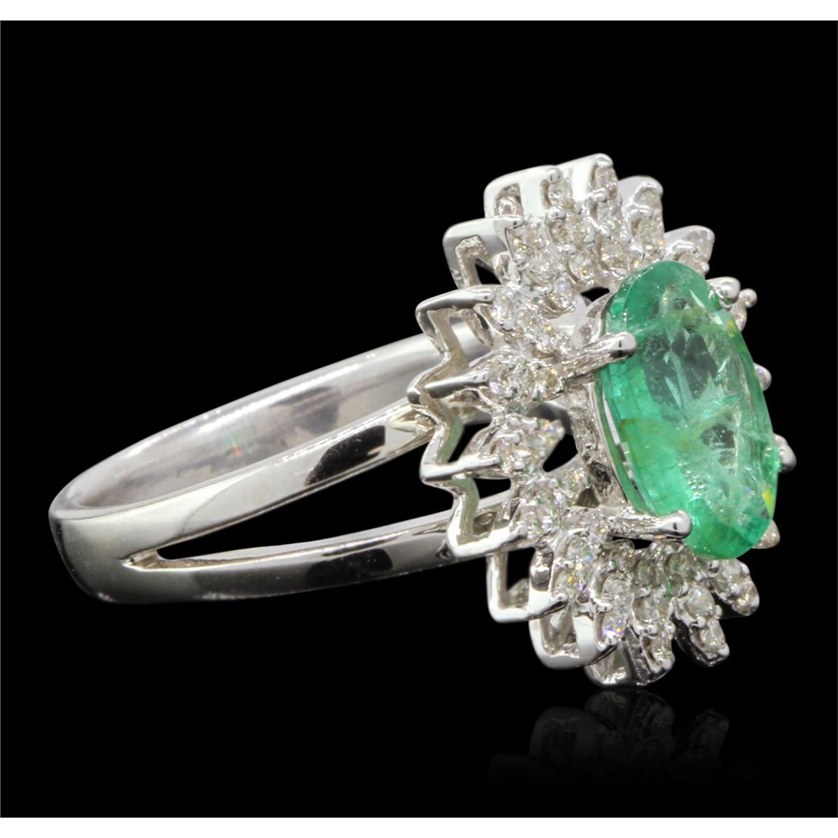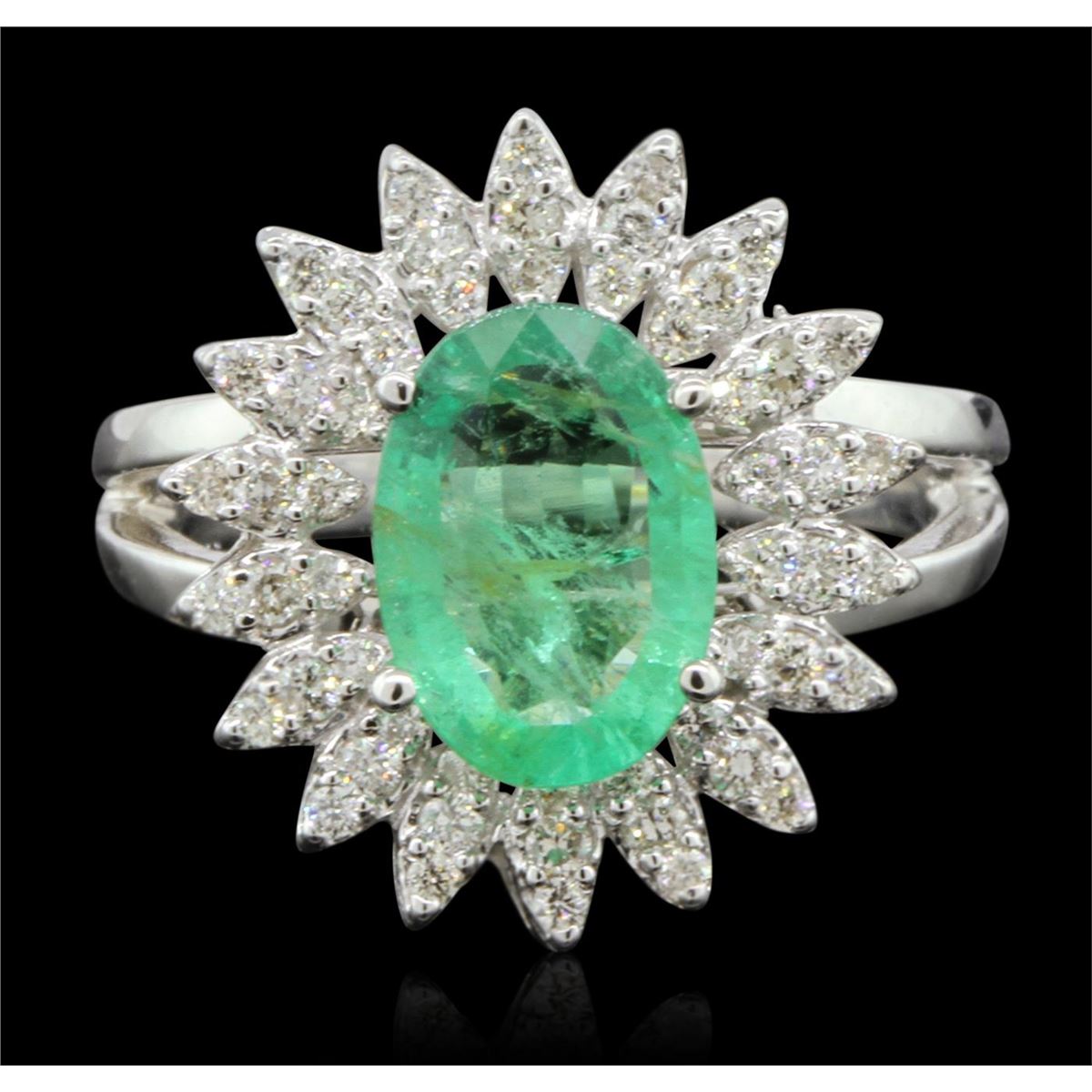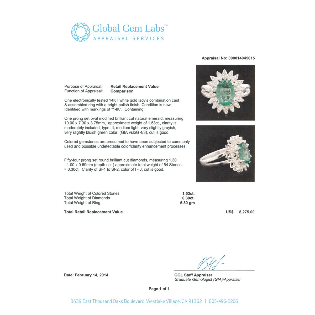 One electronically tested 14KT white gold Ladies combination cast & assembled ring with a bright polish finish. Condition is new. Identified with markings of "14K". Containing: One prong set oval modified brilliant cut natural emerald, measuring 10.00 x 7.30 x 3.75mm, approximate weight of 1.53ct., clarity is moderately included, type III, medium light, very slightly grayish, very slightly bluish green color, (GIA vslbG 4/3), cut is good. Colored gemstones are presumed to have been subjected to commonly used and possible undetectable color/clarity enhancement processes. Fifty-Four prong set round brilliant cut diamonds, measuring 1.30 - 1.00 x 0.69mm (depth est.) approximate total weight of 54 Stones = 0.30ct. Clarity of SI-1 to SI-2, Color of I - J, Cut is Good. Total Weight of Colored Stones 1.53ct. Total Weight of Diamonds 0.30ct. Total Weight of Ring 5.80gm. GGL Appraised at $8,275.00.