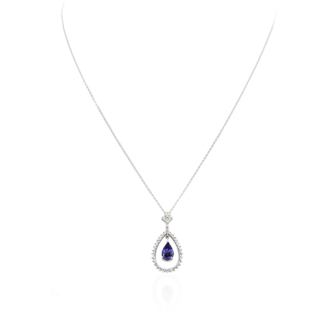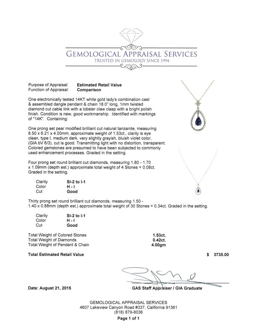 One electronically tested 14KT white gold lady's combination cast & assembled dangle pendant & chain 18.0" long, 1mm twisted diamond cut cable link with a lobster claw clasp with a bright polish finish. Identified with markings of "14K". Condition is new, good workmanship. Containing: One prong set pear modified brilliant cut natural tanzanite, measuring 8.50 x 6.21 x 4.00mm, approximate weight of 1.53ct., clarity is eye clean, type I, medium dark, very slightly grayish, bluish violet color, (GIA bV 6/3), cut is good. Transmitting light with no distortion, transparent. Colored gemstones are presumed to have been subjected to commonly used enhancement processes. Graded in the setting. Four prong set round brilliant cut diamonds, measuring 1.80 - 1.70 x 1.09mm (depth est.) approximate total weight of 4 Stones = 0.08ct. Graded in the setting. Clarity: SI-2 to I-1. Color: H - I. Cut Good Thirty prong set round brilliant cut diamonds, measuring 1.50 - 1.40 x 0.88mm (depth est.) approximate total weight of 30 Stones = 0.34ct. Graded in the setting. Clarity: SI-2 to I-1. Color: H - I. Cut Good. Total Weight of Colored Stones 1.53ct. Total Weight of Diamonds 0.42ct. Total Weight of Pendant & Chain 4.00gm. GAS Appraised at $3,735.00.
