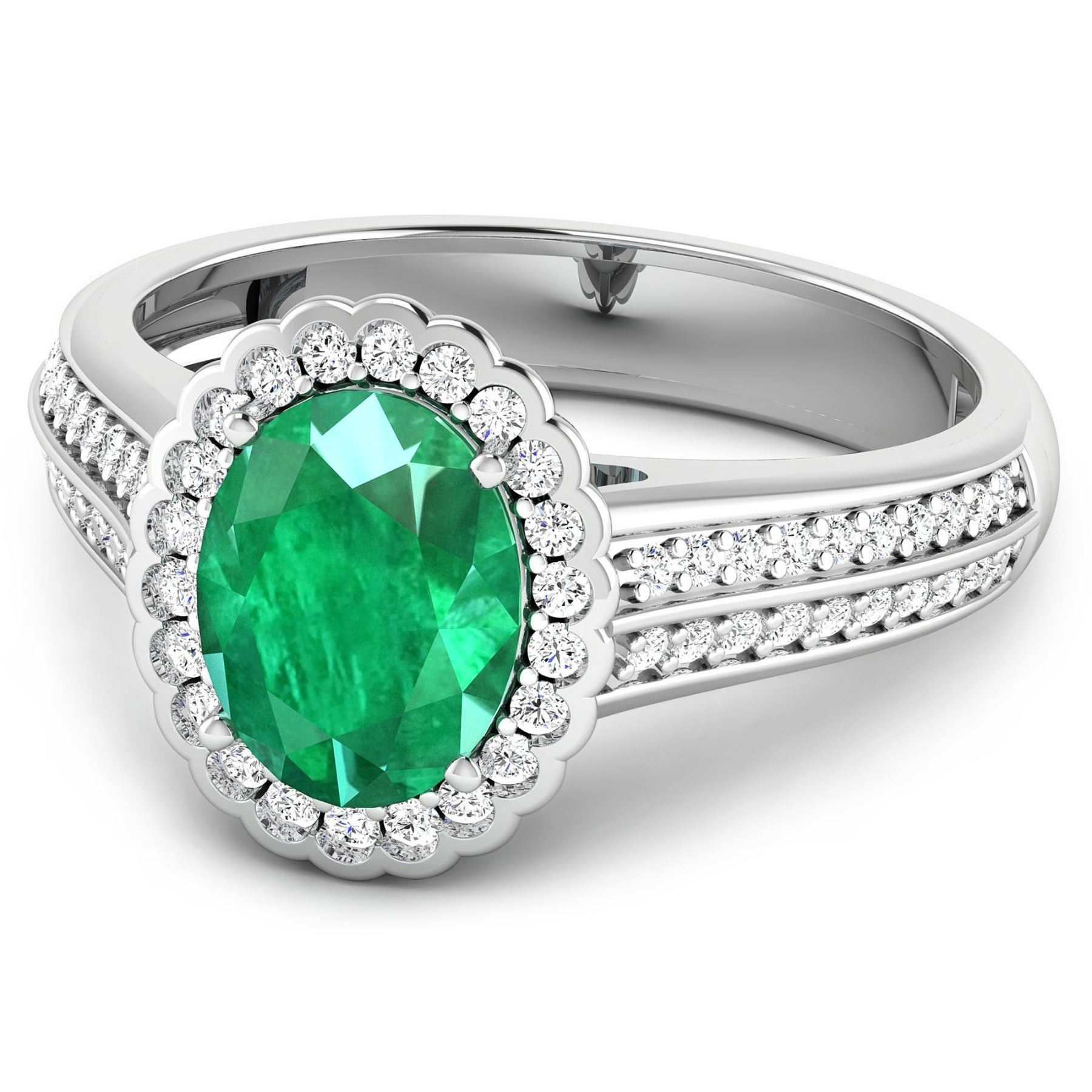 Zambian Emerald (AA) Oval 9x7mm - 1Pc + White Diamond F/C Round 1.20mm - 30Pcs + White Diamond F/C Round 1.10mm - 20Pcs + White Diamond F/C Round 1.00mm - 12Pcs (I1-I2/I color). Total weight of gemstone is 1.53cts. Total weight of Diamonds is 0.42cts. Total weight of this ring is 3.6 grams. Ring size 7.