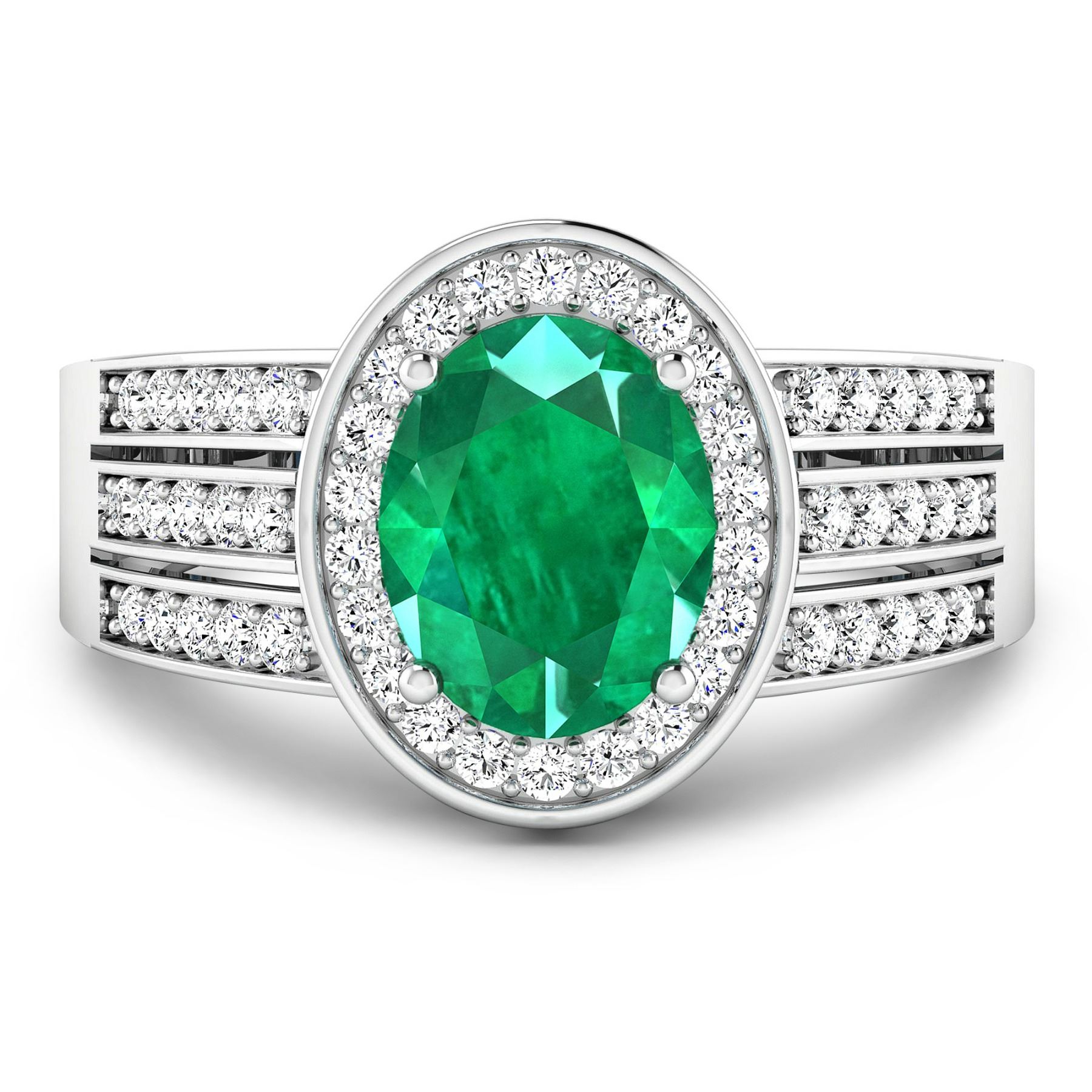 Zambian Emerald (AA) Oval 9x7mm - 1Pc + White Diamond F/C Round 1.30mm - 32Pcs + White Diamond F/C Round 1.20mm - 6Pcs + White Diamond F/C Round 1.10mm - 6Pcs + White Diamond F/C Round 1.00mm - 8Pcs ( SI-2/HI ) Total weight of gemstone is 1.53cts. Total Diamond weight is 0.44cts. Total weight of this ring is 3.56 grams. Ring size 7.
