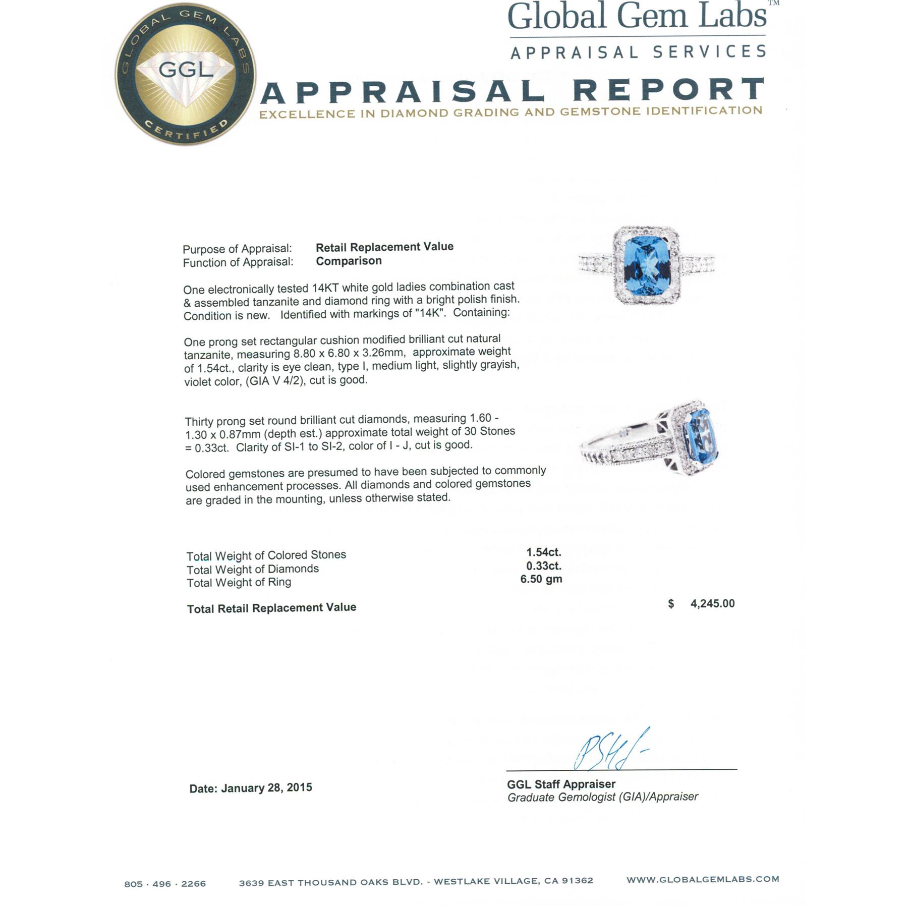 One electronically tested 14KT white gold ladies combination cast & assembled tanzanite and diamond ring with a bright polish finish. Identified with markings of "14K". Condition is new. Containing: One prong set rectangular cushion modified brilliant cut natural tanzanite, measuring 8.80 x 6.80 x 3.26mm, approximate weight of 1.54ct., clarity is eye clean, type I, medium light, slightly grayish, violet color, (GIA V 4/2), cut is good. Thirty prong set round brilliant cut diamonds, measuring 1.60 - 1.30 x 0.87mm (depth est.) approximate total weight of 30 Stones = 0.33ct. Clarity: SI-1 to SI-2. Color: I - J, Cut is Good. Colored gemstones are presumed to have been subjected to commonly used enhancement processes. All diamonds and colored gemstones are graded in the mounting, unless otherwise stated. Total Weight of Colored Stones 1.54ct. Total Weight of Diamonds 0.33ct. Total Weight of Ring 6.50 grams. GGL Appraised.