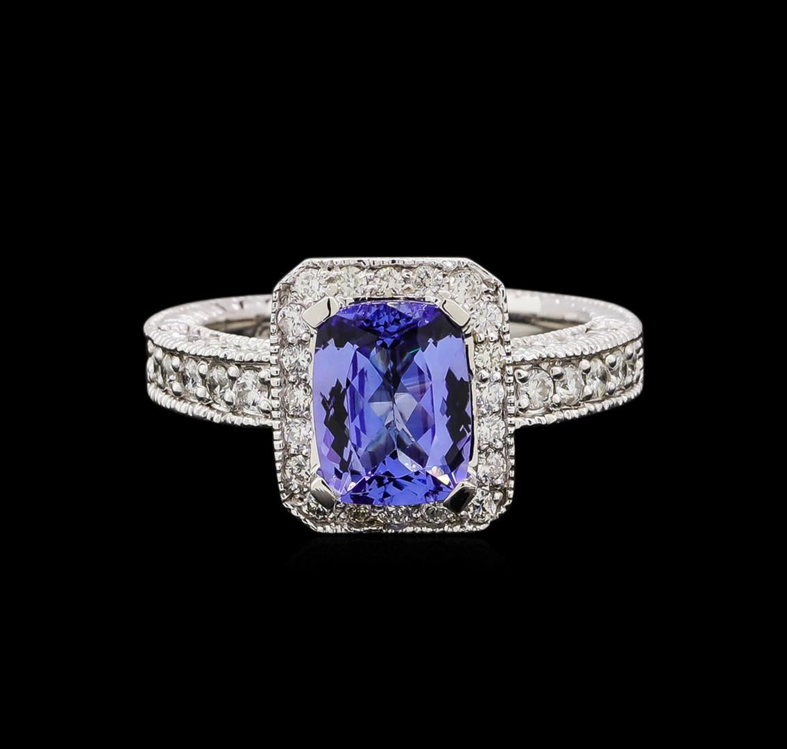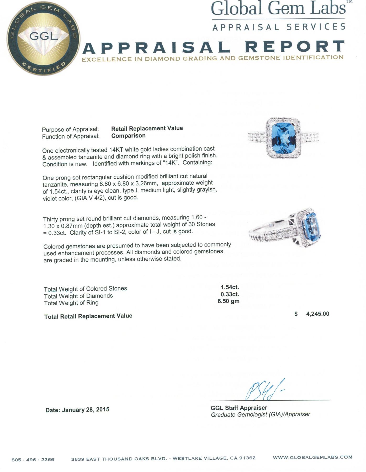 One electronically tested 14KT white gold ladies combination cast & assembled tanzanite and diamond ring with a bright polish finish. Identified with markings of "14K". Condition is new. Containing: One prong set rectangular cushion modified brilliant cut natural tanzanite, measuring 8.80 x 6.80 x 3.26mm, approximate weight of 1.54ct., clarity is eye clean, type I, medium light, slightly grayish, violet color, (GIA V 4/2), cut is good. Thirty prong set round brilliant cut diamonds, measuring 1.60 - 1.30 x 0.87mm (depth est.) approximate total weight of 30 Stones = 0.33ct. Clarity: SI-1 to SI-2. Color: I - J, Cut is Good. Colored gemstones are presumed to have been subjected to commonly used enhancement processes. All diamonds and colored gemstones are graded in the mounting, unless otherwise stated. Total Weight of Colored Stones 1.54ct. Total Weight of Diamonds 0.33ct. Total Weight of Ring 6.50 grams. GGL Appraised.