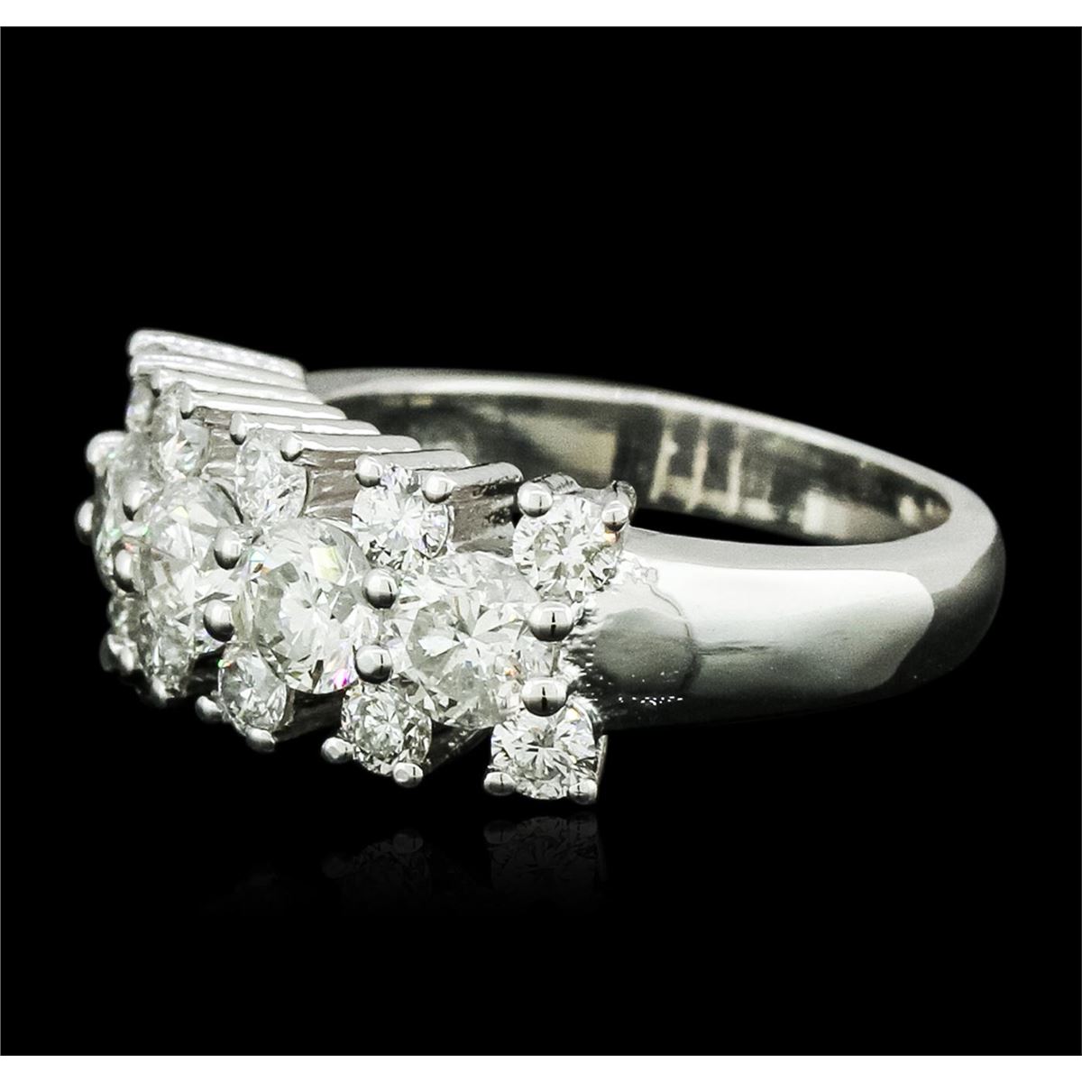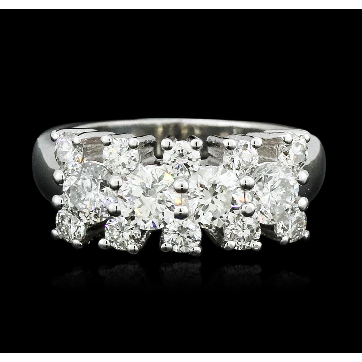 One electronically tested 14KT white gold ladies cast diamond ring with a bright polish finish. Identified with markings of "14K". Condition is new. Containing: Four prong set round brilliant cut diamonds, measuring 4.20 - 4.20 x 2.54mm (depth est.) approximate total weight of 4 Stones = 1.09ct. Clarity: SI-2. Color: J. Ten prong set round brilliant cut diamonds, measuring 2.30 - 2.30 x 1.38mm (depth est.) approximate total weight of 10 Stones = 0.45ct. Clarity: SI-1 to I-1. Color: I - J. All diamonds are graded in the mounting, unless otherwise stated. Total Weight of Diamonds 1.54ct. Total Weight of Ring 7.30 grams. GGL Appraised at $7,020.00.