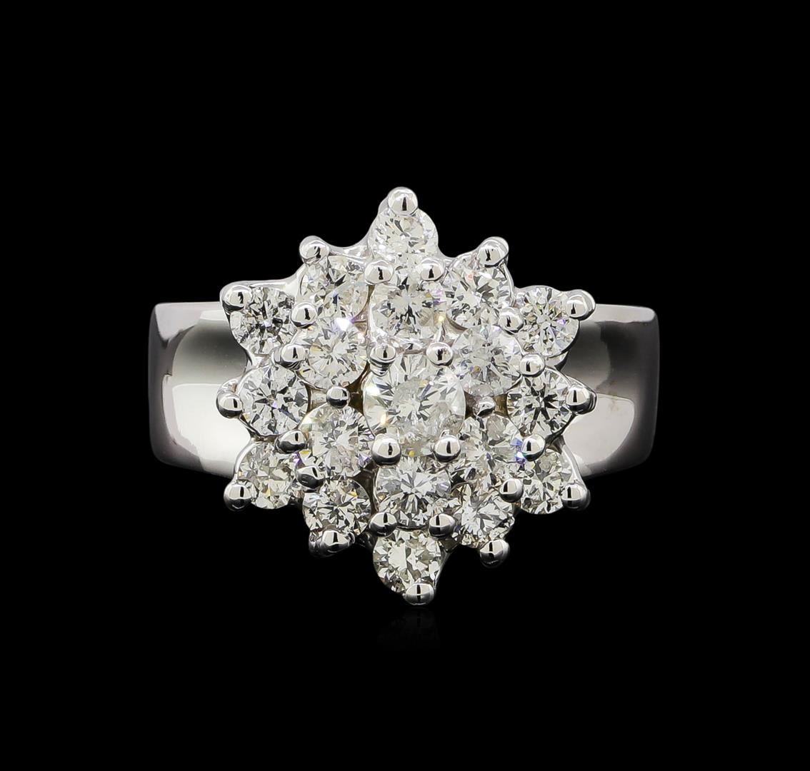 One electronically tested 14KT white gold ladies cast diamond ring with a bright polish finish. Identified with markings of "14K". Condition is new. Containing: One prong set round brilliant cut diamond, measuring 3.80 - 3.80 x 2.28mm (depth est.) approximate weight of 0.20ct. Clarity: I-2. Color: H, Cut is Good. Eighteen prong set round brilliant cut diamonds, measuring 2.50 - 2.50 x 1.50mm (depth est.) approximate total weight of 18 Stones = 1.35ct. Clarity: SI-2 to I-2. Color: H - I, Cut is Good. Diamonds are graded in the mounting, unless otherwise stated. Total Weight of Diamonds 1.55ct. Total Weight of Ring 8.50 grams. GGL Appraised at $3,335.00.