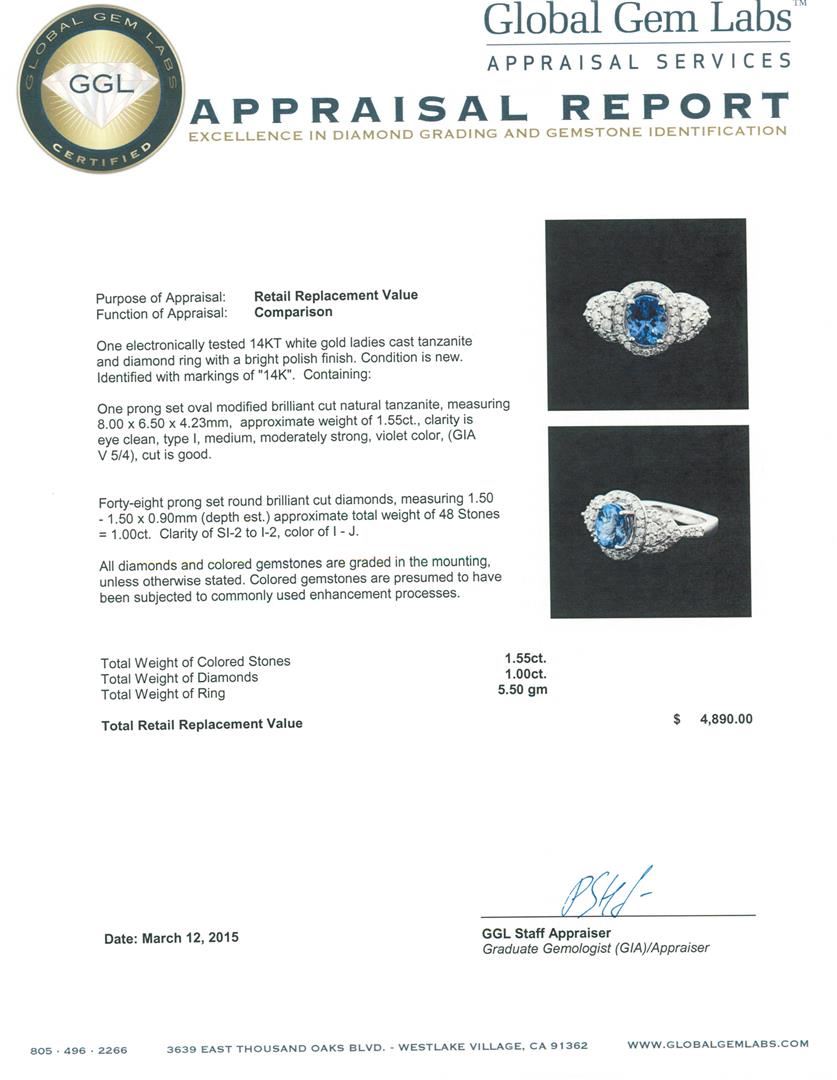 One electronically tested 14KT white gold ladies cast tanzanite and diamond ring with a bright polish finish. Identified with markings of "14K". Condition is new. Containing: One prong set oval modified brilliant cut natural tanzanite, measuring 8.00 x 6.50 x 4.23mm, approximate weight of 1.55ct., clarity is eye clean, type I, medium, moderately strong, violet color, (GIA V 5/4), cut is good. Forty-Eight prong set round brilliant cut diamonds, measuring 1.50 - 1.50 x 0.90mm (depth est.) approximate total weight of 48 Stones = 1.00ct. Clarity: SI-2 to I-2. Color: I - J. All diamonds and colored gemstones are graded in the mounting, unless otherwise stated. Colored gemstones are presumed to have been subjected to commonly used enhancement processes. Total Weight of Colored Stones 1.55ct. Total Weight of Diamonds 1.00ct. Total Weight of Ring 5.50 grams. GGL Appraised at $4,890.00.