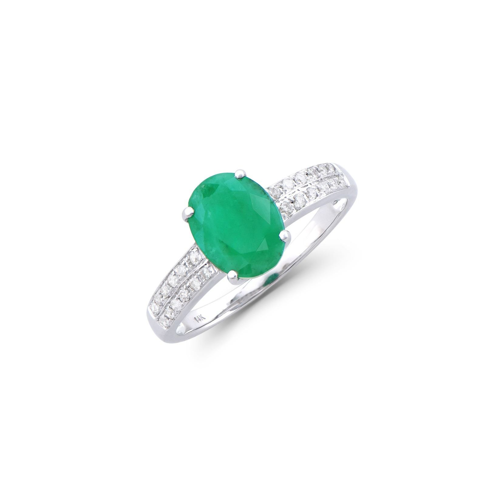 (1) Emerald with a total weight of 1.55cts. (24) round Diamonds with a total weight of 0.20cts with a color of H-I and clarity of I1-I2. Total weight of the ring is 2.10 grams. Ring size 7.5.
