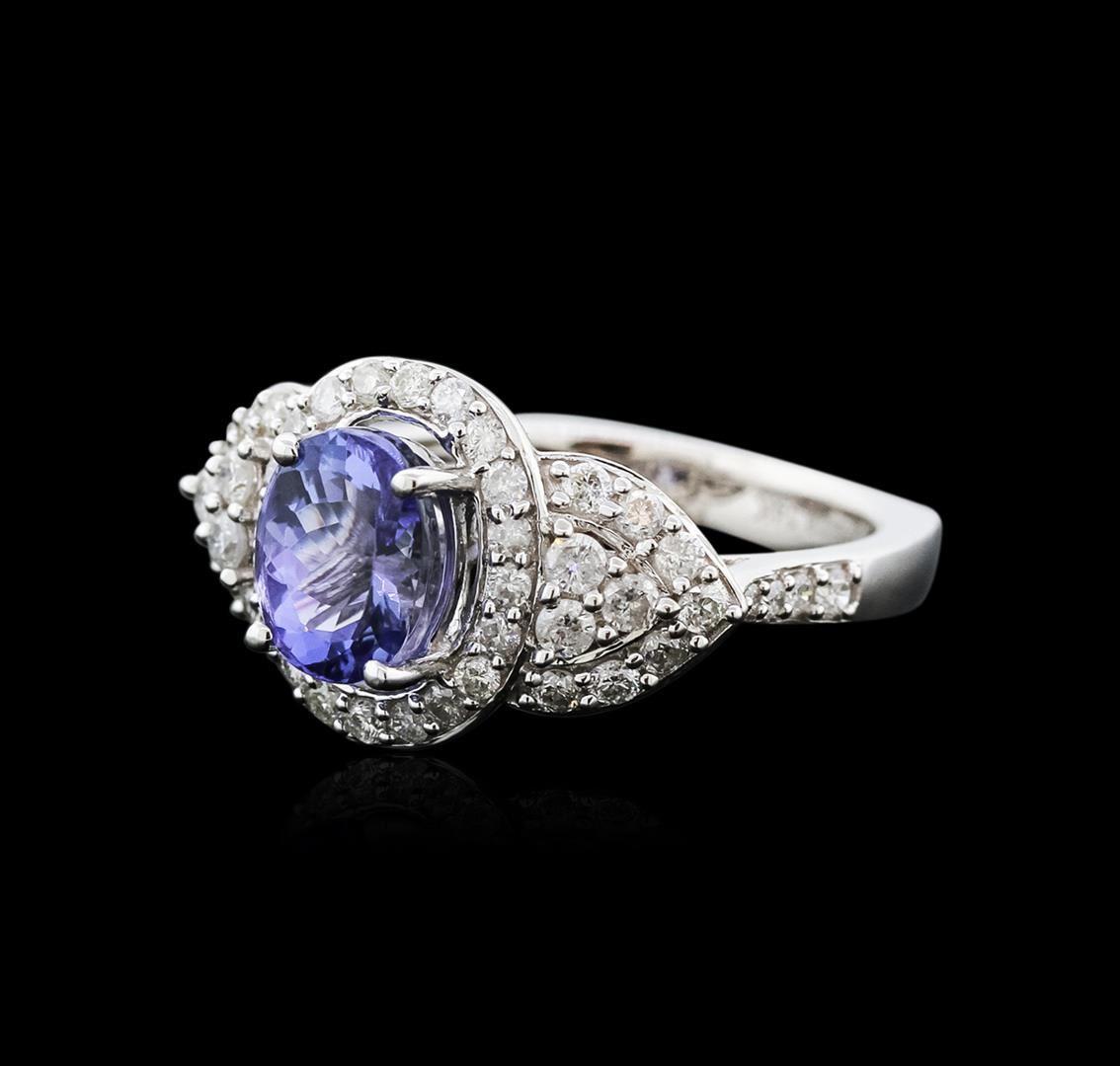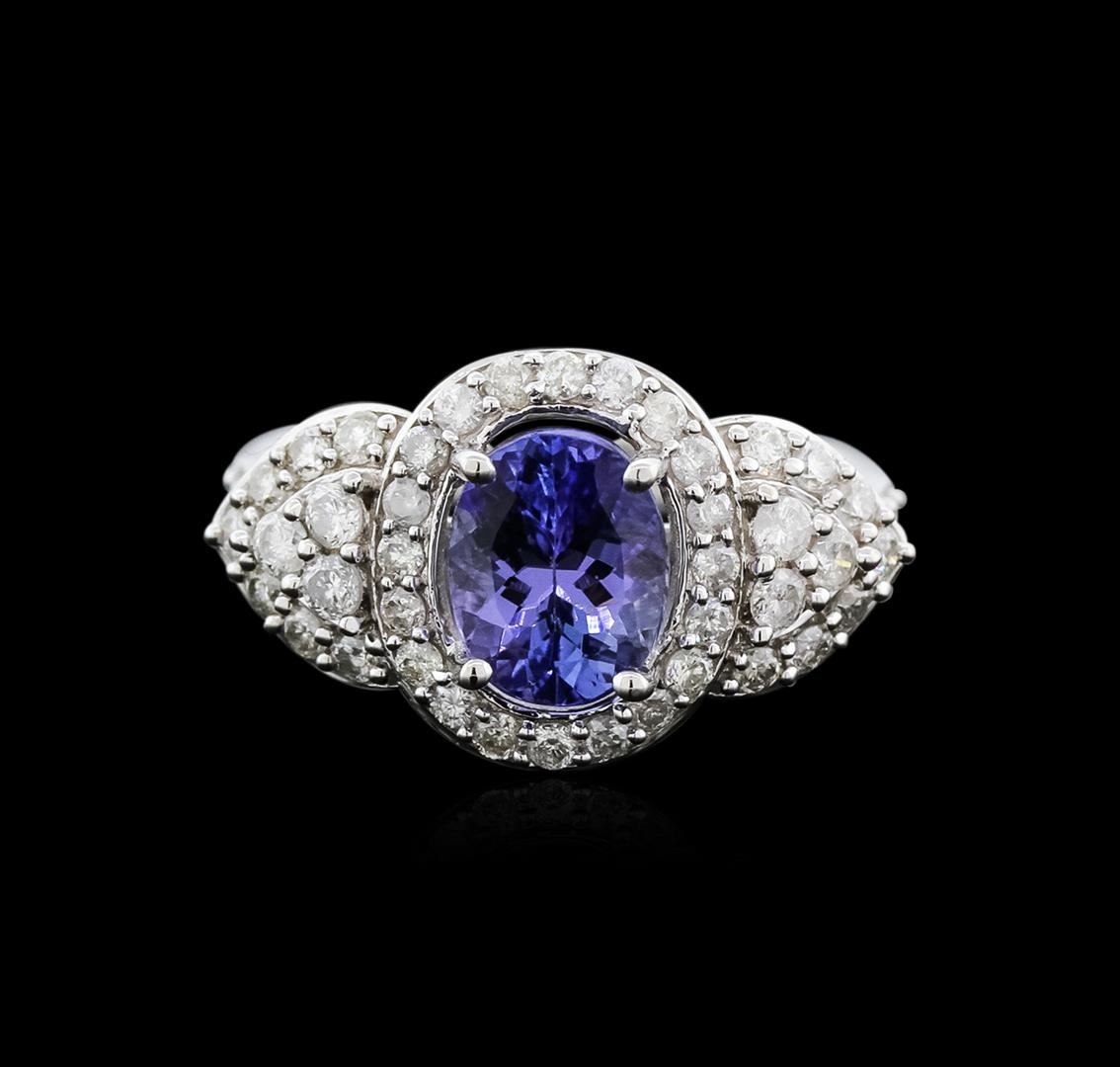 One electronically tested 14KT white gold ladies cast tanzanite and diamond ring with a bright polish finish. Identified with markings of "14K". Condition is new. Containing: One prong set oval modified brilliant cut natural tanzanite, measuring 8.00 x 6.50 x 4.23mm, approximate weight of 1.55ct., clarity is eye clean, type I, medium, moderately strong, violet color, (GIA V 5/4), cut is good. Forty-Eight prong set round brilliant cut diamonds, measuring 1.50 - 1.50 x 0.90mm (depth est.) approximate total weight of 48 Stones = 1.00ct. Clarity: SI-2 to I-2. Color: I - J. All diamonds and colored gemstones are graded in the mounting, unless otherwise stated. Colored gemstones are presumed to have been subjected to commonly used enhancement processes. Total Weight of Colored Stones 1.55ct. Total Weight of Diamonds 1.00ct. Total Weight of Ring 5.50 grams. GGL Appraised at $4,890.00.